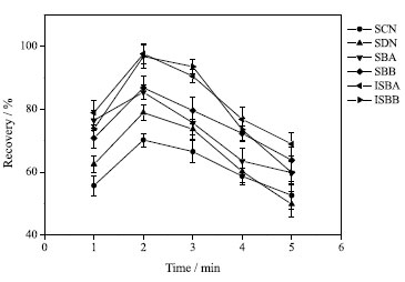 ![]() Figure 6. Effect of extraction time on extraction efficiency (75% methanol solvent, 50 mL; volume of extractant, 600 µL; dispersant, acetonitrile, 500 µL; ultrasound time, 2 min; no salt)