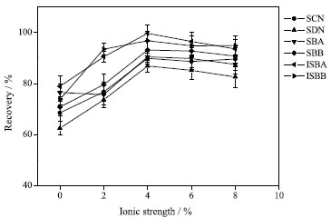 Effect of ionic strength The effect of ionic strength on extraction efficiency was studied by adding 0, 2, 4, 6 and 8% sodium chloride to the prepared samples. The results showed that the extraction efficiency increased with the increase of salt dosage. When the salt concentration was 4%, the extraction efficiency was the best (see Figure 7). The results showed that different salt concentrations had no significant effect on the recovery of six effective composition of Silybum marianum. Therefore, the ionic strength of the sample solution was set to 4% for further experiments.