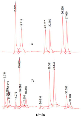 ![]() Figure 8. High-performance liquid chromatograms of six target analytes (A: 50 µg mL-1 standard solution of six target analytes; B: sample solution. SCN tR = 16.023 min, SDN tR = 18.719 min, SBA tR = 28.817 min, SBB tR = 30.760 min, ISBA tR = 36.226 min, ISBB tR = 37.966 min)