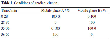 EXPERIMENTAL Materials SCN, SDN, SBA, SBB, ISBA and ISBB were purchased from the Alta Scientific Co., Ltd. (Tianjin, China). The stock solution was prepared by dissolving each substance in chromatographic grade methanol with a concentration of 1 mg mL-1 and storing it at 4 °C in the dark. Flat bottom glass insert (400 µL) was obtained from Agilent Technologies (5181-3377, USA). 1-Methyl-3-octyl imidazole hexafluorophosphate (99.5%, [OMIM]PF6), 1-hexyl-3-methylimidazole trifluoromethane sulfonate (99.5%, [HMIM]OTF) were purchased from the Macklin Reagent Co., Ltd. (Beijing, China). Methanol, ethanol and acetonitrile (chromatographic grade) were purchased from Merck (Shanghai, China). Acetone and ethanol chromatographic grade were purchased from Wuhan Huashen reagent Co., Ltd. (Wuhan, China). Phosphoric acid analytical grade was purchased from Kemio Chemical Reagent Co., Ltd. (Tianjing, China). Deionized water was used throughout the experiment. The other solvents were all analytical grade. Chromatographic analysis The chromatographic analysis was performed on an e2695 HPLC system (Waters Co., Ltd., USA) which was equipped with a diode-array detector system, an online degassing device, a thermostatic column compartment, and a two-element system. Chromatographic separation was carried out on a Waters carboxy-octadecyl silane bonded silica gel (250 mm × 4.6 mm, 5 µm) with an in-line filter in front of the column. The mobile phase flow rate was set at 1.0 mL min-1 and the mobile phase consisted of aqueous phosphoric acid-methanol-water (v/v/v, 0.5:35:65) (A) and phosphoric acid-methanol-water (0.5:50:50, v/v/v) (B). The chromatographic column temperature was set at 30 °C. The gradient elution procedure is shown in Table 1. The analytical injection was set at 10 µL. The method used a UV detector, with detection wavelength of target compounds at 288 nm.