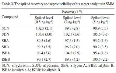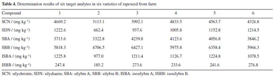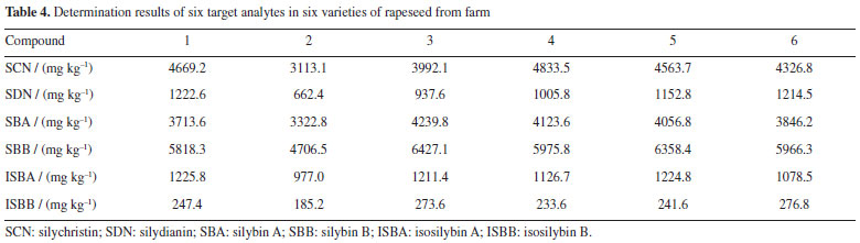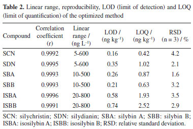 Nan LiI,II; Peng SunI,II,* I. Heilongjiang Bayi Agricultural University, 163319 Daqing, Heilongjiang Province, P. R. China Received: 09/03/2024 *e-mail: byndsunpeng@sina.com A novel pretreatment method ionic liquid-based dispersive liquid-liquid microextraction followed by high-performance liquid chromatography (HPLC) was established and applied in the analysis of silychristin, silydianin, silybin, silybin B, isosilybin A, isosilybin B in Silybum marianum. The critical parameters affecting dispersive liquid-liquid micro-extraction (DLLME), including selection of dispersive solvent and extraction solvent, volume of dispersive solvent and extraction solvent, adjustment of pH, salt concentration, extraction time, were investigated by single factor study. Under optimum conditions, all of the target analytes presented good linearity (r > 0.9991) and satisfied recoveries (recoveries > 89.5%, relative standard deviation (RSD) < 4.6%). The limits of detection and quantification were 0.16 to 0.74 ng kg-1 and 0.42 to 2.52 ng kg-1, respectively. The developed method is sensitive, rapid, accurate and employable to simultaneously determine six target compounds in Silybum marianum. INTRODUCTION Silybum marianum ((L.) Gaertn.), a medicinal plant of Compositae, has a strong adaptability against drought and cold resistance.1 It is planted in Northeast China, Inner Mongolia, Hebei, Shanxi, and other places. As an economic crop for both medicine and food, its fruit is the main medicinal part, including silychristin (SCN), silydianin (SDN), silybin A (SBA), silybin B (SBB), isosilybin A (ISBA), and isosilybin B (ISBB).2 It has the functions of antioxidation,3 regulating immunity4 and protecting liver.5 A large number of studies have shown that silybin, as the highest content of Silybum marianum seed (SMS) lignin in the effective extract, can maintain the enzyme system in cells, enhance cell metabolism, protect cells and promote fat transfer.6-10 It has a significant effect on the treatment of liver diseases. It is commonly used in the treatment of simple or alcoholic fatty liver acute and chronic hepatitis, and other diseases with abnormal liver function.11-13 However, the standard methods for the determination of SCN, SDN, SBA, SBB, ISBA, and ISBB in SMS have not been established in China. Therefore, it is necessary to establish a rapid, accurate and efficient detection method for SMS compounds, which is conducive to the screening, processing and utilization of high-quality varieties of SMS. SCN, SDN, SBA, SBB, ISBA, ISBB in SMS are extracted mainly by normal temperature and ultra-high pressure extraction,14 ultrasonic assisted extraction,15 enzyme assisted extraction,16 supercritical CO2 extraction17 and microwave-assisted extraction.18 Special equipment is required for normal temperature and ultra-high pressure, supercritical CO2 extraction and microwave-assisted extraction, and corresponding enzymes need to be selected for enzyme assisted extraction. It is not easy to implement and popularize the method. It is important to establish a new method for sample pretreatment of SCN, SDN, SBA, SBB, ISBA, ISBB in order to obtain precise, accurate and reliable results, because it is difficult to extract multiple compounds from plant-derived sample. By optimizing the pretreatment conditions, we aim to enhance the method's selectivity, precision, sensitivity, and accuracy while improving analytical efficiency and reducing costs. There have been more and more ways to determine several components extracted from plant-derived sample simultaneously, such as solid-liquid phase extraction19 and dispersive solid-phase extraction.20 However, these detection methods have some shortcomings. Dispersive liquid-liquid microextraction (DLLME) was developed and applied by Rezaee et al.21 in 2006. DLLME has been widely applied to the analyses of various compounds in the environmental, food real samples and has attracted great attention due to its simplicity of operation, rapidity, low price, high recovery rate and environment friendly.22,23 Ionic liquids (ILs) are ionic media with unique physical and chemical properties. It is an environmentally friendly solvent and has attracted extensive attention in many fields. ILs is a potential solvent for DLLME to enrich typical organic compounds. In addition, these green solvents as sample preparation extractant have been used in such as supported liquid membrane extraction,24 liquid-liquid extraction,25,26 solid-phase microextraction,27,28 and so on. ILs as extractant is widely used in plant extraction.29-31 The above facts show that ILs, as a highly dispersed solvent, has great potential for the analysis of components from crop samples. Compared to traditional liquid-liquid extraction, ionic liquids dispersive liquid-liquid microextraction (ILs-DLLME) has the advantages of low sample consumption, high extraction efficiency, and easy operation. In the present work, we used ILs-DLLME combined with the high-performance liquid chromatography (HPLC) to simultaneously determine SCN, SDN, SBA, SBB, ISBA, ISBB in different SMS varieties. The key parameters affecting the efficiency of ILs-DLLME were researched.