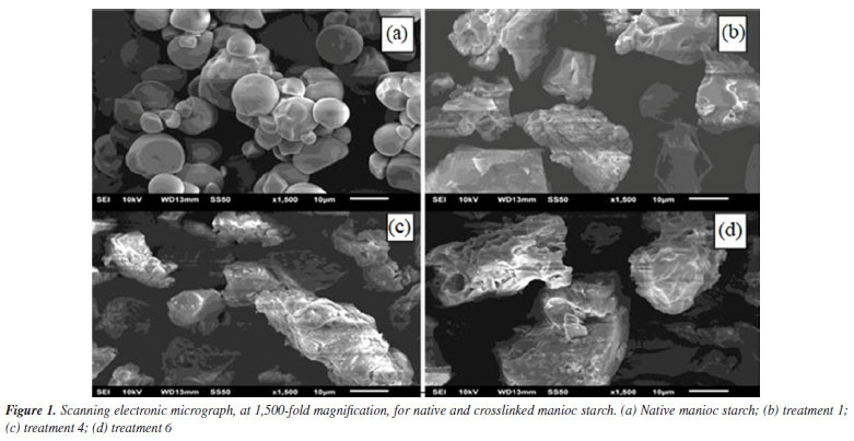 RESULTS AND DISCUSSION Characterization of native and crosslinked starch Scanning electronic microscopy (SEM) Figure 1 illustrates the morphology of native manioc starch and of some crosslinked manioc starches (T1, T4 and T6). SEM analysis revealed the characteristic structure of native manioc starch granules (Figure 1a), of truncated or oval shape, with sizes in agreement with those reported in the literature - 7 to 14 μm.41 As for crosslinking-modified starches, the breakage of characteristic starch granules and formation of irregular, bigger solid structures could be observed (Figures 1b to 1d). Treatment T4 (Figure 1c) resulted in apparently more compact granules; while in the treatments T1 and T6 samples (Figures 1b and 1d, respectively), which share lower amount of STMP crosslinking agent, orifices of different diameters in the fragments can be observed.
