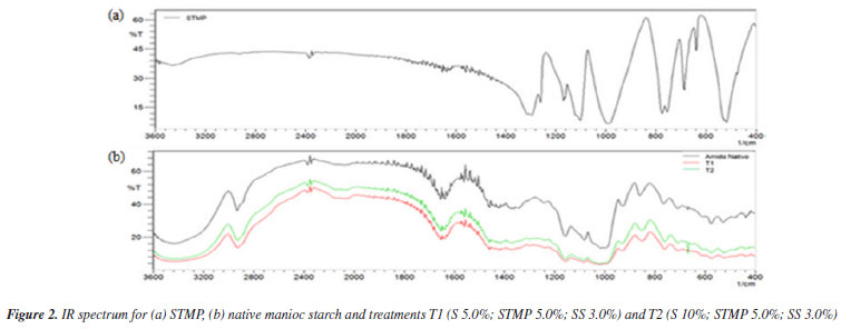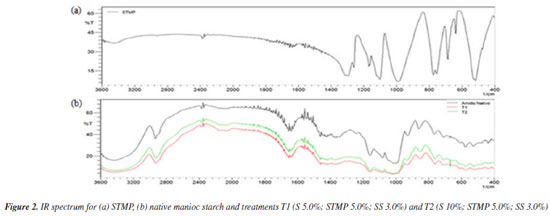 Infrared spectroscopy (IR) Figure 2a shows STMP spectra, this compound being employed in the present study as crosslinking agent, and in Figure 2b the native manioc starch and crosslinked starches T1 and T2 spectra can be seen. Crosslinked starches samples enable us to observe some of the main starch bands and those of sodium trimetaphosphate, exhibiting, however, modified intensity and in certain cases, a shift. From the STMP spectrum (Figure 2a) it is possible to observe the main characteristic bands: at 520 cm-1, the band related to the out-of-plane vibrational stretching for the phosphorus links of the kind (O-P-O) and/or (P=O); at 685 cm-1, due to the (O-P-O) symmetrical stretching; bands at the region between 745 and 785 cm-1 are related to the (P-O-P) symmetrical stretching; between 995-1085 cm-1 are bands due to the (P-O-P) asymmetric vibrational stretching; bands at 990 and 1120 cm-1 can also be attributed to (P-O-P) symmetrical stretching; the band in the region of 1165 cm-1 can be attributed to the (P-O-P) symmetrical stretching; bands in the region of 1240 to 1320 cm-1 refer to the asymmetrical stretching of the (P=O) link.42 Figure 2b shows the infrared spectrum of native manioc starch used in the experiment. In the region between 3200 and 3600 cm-1 the presence of a wide band resulting from the hydroxyl group stretching vibrations -O-H (axial deformation), associated by hydrogen bonds can be seen. At approximately 2860 cm-1 are the stretching vibrations related to C-H bonds. In the region between 1440-1480 cm-1 the angular deformation of the CH2 group can be seen. Bands positioned in the regions of 920 and 1160 cm-1 are due to C-O and C-C bond stretching. Stretching of glycosidic bonds (α-1,4 C-O-C) are observed in the region of 1050 to 900 cm-1, more specifically, ring symmetric and asymmetric axial deformations at 1040 and 1160 cm-1, respectively. The starch spectrum shows two weak bands (shoulders) at approximately 1047 and 1022 cm-1, which are attributed to axial deformations of primary alcohols C-OH and to CH2.42
