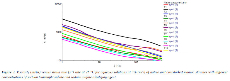 According to Smith,43 these bands can be associated with the starch crystalline ordination (increasing proportionately with the polymer crystallinity), and with the amorphous characteristic of starch (increasing with the reduction in crystallinity), respectively. In the region around 1050 and 1100 cm-1, stretching of primary and secondary alcohols O-H band of the starch ring is observed. The band seen at 1644 cm-1 is related to the presence of bonded water, which was also observed for starch samples in other works.44,45 In Figure 2b, the spectra of crosslinked samples T1 and T2 under different conditions can also be observed. The bands in the region of 1047 cm-1 related to the crystalline structure, and 1022 cm-1, related to the native starch amorphous structure, respectively, and already previously reported, are poorly defined, although being prominent. As for the native manioc starch, slight reduction in the band intensity in the 1047 cm-1 region was observed. This can be attributed to the crosslinked sample reduction in crystallinity degree, and a slight enlargement and reduction in the 1022 cm-1 band intensity, related to the increased polymer amorphous structure. According to Li et al.,46 changes in this organization after the crosslinking reaction could be proven by the intensity of these bands. For the crosslinked starches a slight enlargement and a lower intensity of the bands related to the hydroxyl groups unfolding in the region between 3200 and 3600 cm-1 was also observed, based on the SMPT crosslinking reaction with the starch ring hydroxyls. Such fact was also observed in the works by García et al.,47 and Peng et al.48 However, there was significant band reduction in the region of 1100 cm-1, caused by the starch-SMTP crosslinking process involving secondary alcohols hydroxyl groups (such as C4) of the glucose ring and primary alcohols (C6), reducing the intensity of these absorption bands. As relates to the intensity of the bands and their positions in relation to the main functional groups of the crosslinking agent - situated at 520 cm-1 (O-P-O) and/or (P=O); 685 cm-1 (O-P-O); 745 and 785 cm-1 (P-O-P); 995 and 1085 cm-1 (P-O-P); 990 and 1120 cm-1, (P-O-P); 1165 cm-1 (P=O); 1240 to 1320 cm-1 (P=O). P=O at 1210 cm-1 and P-O-C (810 cm-1) - their characterization was not effectively possible for the crosslinked starch samples since they were superimposed to those of native starch. A further factor would be the samples low crosslinking degree, as already reported in the works by Li et al.,46 and Peng et al.,48 However, very intense crosslinking is not desirable, since this could render the material insoluble. Rheometric analyses The viscosity versus strain rate curves of Figure 3 represent the rheological behavior of native manioc starch aqueous solutions and crosslinked starches obtained from the different treatments.