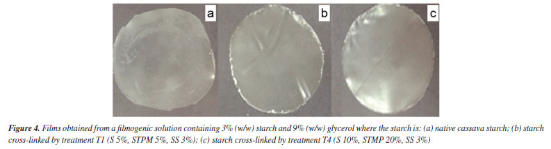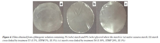 The highest k values were obtained for the T2 treatments, with the lowest concentrations of crosslinking and alkalizing agents relative to starch, and T12, which corresponds to the central spot (Table 2). Values for ɳ (flow behavior indices) were lower than unity (1) which characterizes non-Newtonian fluids with pseudoplastic behavior, that is, the farther from unity, the higher the pseudoplasticity, characterized by reduction in viscosity with increase in stress. The same behavior was observed by López et al.,49 in flow curves for starch and modified starches filmogenic suspensions. The T12 treatment samples, representing the central spot, and the T2 treatment sample exhibited the best results. Preparation and characterization of films Macroscopic and microscopic properties According to Figure 4 the cross-linking reaction was favorable for film formation. The cross-linked cassava starch films had better homogeneity, easiness of handling, continuity and brightness (Figures 4b and 4c) than the film made from native starch (Figure 4a).