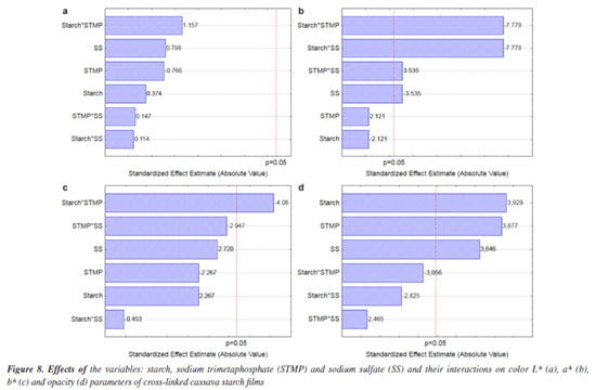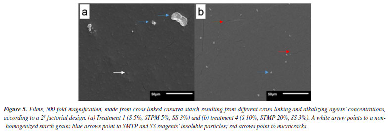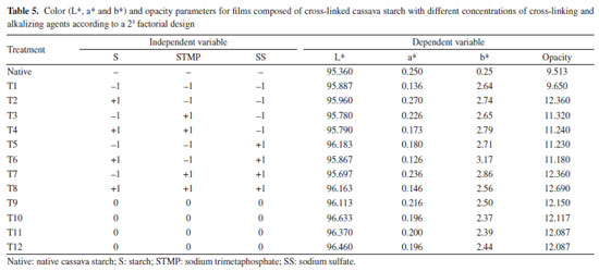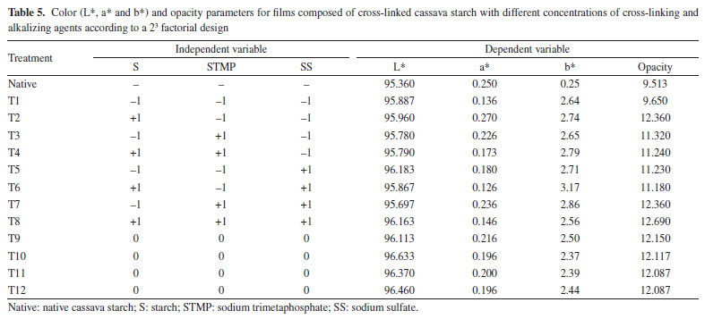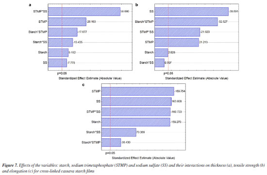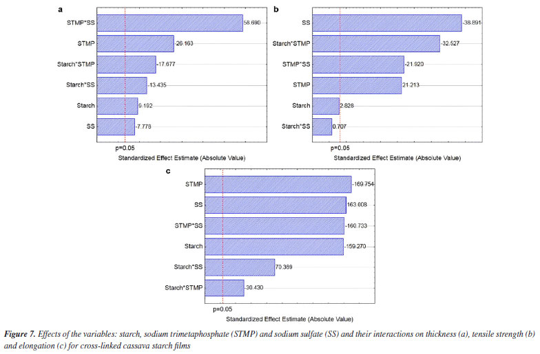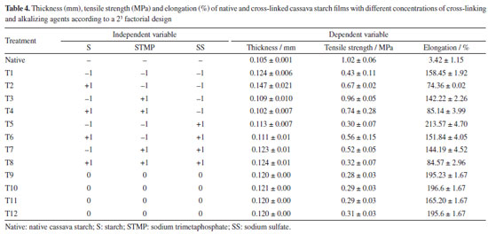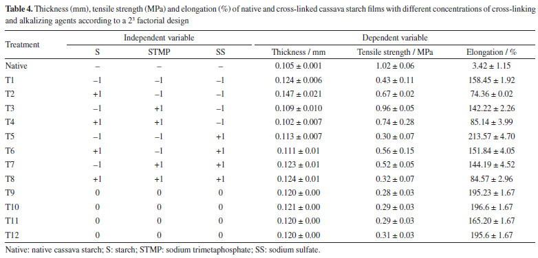 The cross-linking increased the film thicknesses, except for the T4 film, which had the lowest thickness, followed by the T3 film, both with the highest STMP and lowest SS concentrations. However, all of them were thin and varied between 0.102 and 0.147 mm thick, as shown in Table 4. According to Embuscado and Huber,61 biodegradable films are generally less than 0.300 mm thick. This is an important physical characteristic, as their use for packaging requires consideration of the type, volume, and weight of the food to be stored. The values obtained in this study were close to the values observed in the study by Pinto et al.,62 that used "pinhão" (edible seeds of Araucaria brasiliensis) starch, which were between 0.127-0.157 mm thick. All independent variables had significant effects on thickness (Figure 7a). The highest effect was observed for the positive STMP*SS interaction, increasing the film thickness. As in the response to WPV, the result of the interaction effect or simultaneous high addition of STMP*SS demonstrates the negative crosslinking power on starch. It is sure that cross-linking affects film thickness. However, as with the soaking power of crosslinked materials, high crosslinking level reduces the soaking power (water retention within the polymer network), while intermediate crosslink increases the soaking power.63 Higher water retention within the structure results in higher material thickness,63 which explains the higher value observed for T2 - treatment where the lowest SMTP and SS were used, associated with the higher value for starch. The formation of a loose network generates hygroscopic films of greater thickness. The mathematical models obtained for thickness, tensile strength and elongation with the coded variables are shown in Equations 5, 6 and 7, respectively. Thickness = 0.12 + 0.003 × S - 0.009 × STMP - 0.003 × SS - 0.006 × S × STMP - 0.005 × S × SS + 0.021 × STMP × SS (5) Tensile strength = 0.475 + 0.02 × S + 0.15 × STMP - 0.275 × SS - 0.23 × S × STMP + 0.005 × S × SS - 0.155 × STMP × SS (6) Elongation = 158.68 - 48.99 × S - 52.21 × STMP + 50.14 × SS - 9.36 × S × STMP + 21.65 × S × SS - 49.44 × STMP × SS (7) Tensile strength decreased by cross-linking (0.28 ± 0.03 to 0.96 ± 0.05 MPa), and elongation was intensively increased by cross-linking (74.36 ± 0.02 to 213.57 ± 4.70%) compared to films made from native cassava starch (1.02 ± 0.06 MPa and 3.42 ± 1.15%, respectively) (Table 4). For the tensile strength and elongation response variables, the starch*STMP and STMP*SS interactions showed negative effects (Figures 7b and 7c). The interaction of starch*SS was positive. The desired properties for packaging depend on the specific application. In general, packaging that requires extended elongation requires greater tensile strength to provide structural integrity to the packaged product. In other applications, such as in food coatings, a package with greater flexibility is desirable.64 The composition of the films and coatings generally includes plasticizers, compounds that improve the physical or mechanical properties including flexibility, strength and durability. The most commonly used plasticizers are glycerol and sorbitol.65,66 According to Zhang et al.,67 the use of chemically modified starch reduces the tensile strength and results in increased elongation at rupture. Gutiérrez et al.68 found 13.9 MPa for the tensile strength of a native manioc (3% m/v) and glycerol (1.9% m/v) film, the highest value reported in this paper. Lima et al.69 measured the tensile strength of bean starch (3%) films crosslinked with different concentrations of tetraethylorthosilicate (TEOS) (5, 20 and 40% m/m relative to starch) and glycerol addition (30% m/m relative to starch) and found intermediate values between 3.39 and 6.66 MPa. The authors observed increased tensile strength (6.66 MPa) for the 40% m/m TEOS films, while lower TEOS concentration films (5 and 20% m/m) and native starch (control) exhibited lower tensile strength, 3.46, 3.39 and 3.55 MPa, respectively, without any statistical difference among them. Zavareze et al.18 observed for native, oxidized potato starch films (3, 4 and 5% m/v) and glycerol (30% m/m relative to starch) figures between 3.53 and 9.12 MPa and demonstrated that oxidation increases films strength. It can be observed that the whole of the values found in the literature for tensile strength are higher than the values obtained in the present work. On the other hand, elongation values obtained for the crosslinked films are generally higher than those reported in the literature. By comparing elongation data, Zavareze et al.18 found, for native, oxidized potato films (3, 4 and 5% m/v) and glycerol (30% m/m relative to starch) elongation figures varying between 58 and 85% for native starch films, and between 38 and 56% for the films based on oxidized potato starch. Moraes et al.70 found elongation of 29% for a manioc starch (4% m/v) and glycerol (0.60% m/v) film. Lima et al.69 found for a bean starch (3% m/v), glycerol (0.30% m/v) and TEOS (40% m/m relative to starch) film elongation of 30.31%. These are lower values than most of those found in the present study, exception made to treatment 2 (74%), which is similar to the 85% value found by Zavareze et al.18 Sueiro et al.71 studied biodegradable films of cassava starch, pullulan and bacterial cellulose applied by casting methods and also observed a decrease in tensile strength (0.95 ± 0.19 to 1.41 ± 0.40 MPa) and an increase in elongation (56 ± 8 to 88 ± 4%) for the films with added glycerol (plasticizer) when compared to the control (4.82 ± 0.40 MPa and 33 ± 3%). In accordance to Mali et al.,41 and Seligra et al.,72 in general the starch films are broken and have low elongation, this being chiefly attributed to interactions of the sort of hydrogen bonds among polymer chains. Addition of compounds that reduce chain interactions by hydrogen bonds, such as plast