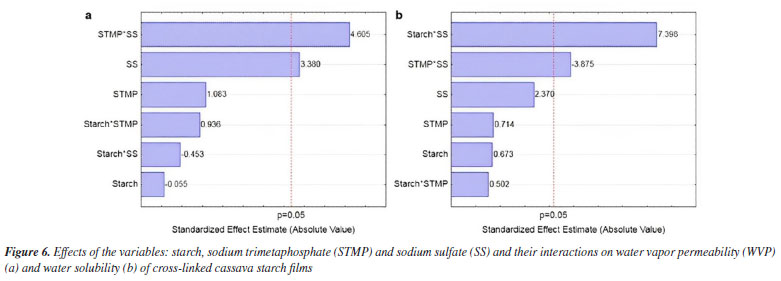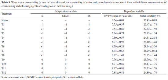 Figure 6 shows the effects of starch and concentrations of the STMP and SS reagents and their interactions on water vapor permeability (WVP). The STMP*SS interaction had a greater unwelcome positive effect on water vapor permeability (Figure 6a). The WVP value for the films produced with the cross-linked starches was reduced and varied between 6.39 (T6) and 9.02 (T8) g mm m-2 day kPa. The mathematical models for the WVP and solubility obtained with the coded variables are shown in Equations 3 and 4, respectively. WPV - 7.79 - 0.02 × S + 1.02 × STMP + 0.32 × SS + 0.28 × S × STMP - 0.14 × S × SS + 1.38 × STMP × SS (3) Solubility = 25.96 + 0.36 × S + 0.38 × STMP + 1.28 × SS + 0.27 × S × STMP + 3.99 × S × SS - 2.09 × STMP × SS (4) Some chemical modifications of starch can increase WVP. Biduski et al.,56 using native sorghum starch submitted to a double modification (acid hydrolysis followed by oxidation) found increased WVP for films from modified starches. The values were 3.94, 4.99 and 5.31 g mm m-2 day kPa for the films prepared from native starch and 5.48, 5.70 and 5.97 g mm m-2 day kPa for films prepared from dual modified starches. These values were slightly lower (higher WVP barrier) than those obtained in the present study. The reduction in WVP can also be obtained by adding less hydrophilic substances. Chinma et al.58 evaluated the effects of temperature (10 to 40 ºC) and relative humidity (50 and 80%) on the WVP (g mm m-2 day kPa) of edible films prepared from manioc starch and soy protein concentrate. Films prepared from manioc starch only without soya protein addition exhibited water vapor permeability of 3.9 to 4.6 g mm m-2 day kPa without statistical difference as for temperature and relative humidity variation. These values are also lower than those found in the present work. Ghasemlou et al.59 assayed WVP for manioc starch films to which plant essential oils had been incorporated. For the control film, which did not contain any essential oil, WVP was around 7.8 g mm m-2 day kPa, this figure being close to those found in the present study. The cross-linking favorably reduced water solubility in all films; films achieved water solubility values between 22.82 and 36.43% (native starch). The higher significant effect was that of the starch*SS interaction (Figure 6b); higher concentrations of these reagents increase the solubility value. This corroborates the data for T6 and T8 films, which exhibited the higher values among the crosslinked films. Basiak et al.60 found values of 30.16, 44.76 and 14.52% for the solubility of films prepared with native starches from wheat, corn and potato, respectively, showing that films solubility depends on the starch source. In the present study the solubility of native cassava starch film was 36.43%, but cross-linking reduced it. The water solubility of biodegradable films is dependent on the type of application; films used in products with high moisture content must have low solubility values, while edible films must have higher water solubility.58 Thickness and mechanical properties The results obtained for thickness (mm), tensile strength (MPa) and elongation (%) of the films composed of cross-linked cassava starch are shown in Table 4 and the effects of starch, sodium trimetaphosphate (STMP) and sodium sulfate (SS) and their interactions on these responses are shown in Figure 7.