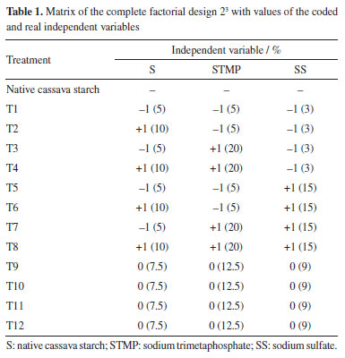 EXPERIMENTAL Cross-linking reactions For the chemical modification of native cassava starch, commercial (YOKI®, Brazil) native cassava starch with 12% (w/w) humidity - determined according to the AOAC 44-15A method32 - was purchased from a local store in the city of Pelotas, RS, and chemically modified by cross-linking. Sodium trimetaphosphate (STMP) p.a. (Synth®, Brazil), anhydrous sodium sulfate (SS) p.a. (Synth®, Brazil), glycerol p.a. (Synth®, Brazil), alcohol 96% (v/v), and distilled water were also used in the experiments. To evaluate the effects of SMTP cross-linking agent (5.0, 12.5 and 20% w/w), alkalizing agent SS (3.0, 9.0 and 15.0% w/w) and cassava starch (5.0, 7.5 and 10% w/w) a complete factorial design 23 (Table 1) was performed.
