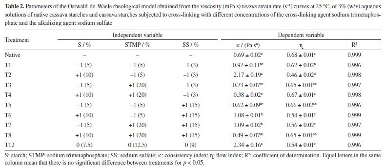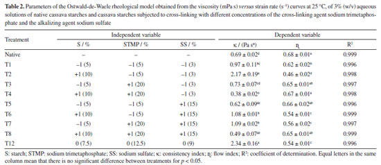Significant changes were observed for the rheological behavior of crosslinked starches relative to native starch, with a trend to increased pseudoplasticity, and variable effects of crosslinking on viscosity. Indexes of consistency (k) and flow (ɳ), related to the viscosifying capacity and pseudoplasticity, respectively, are reported in Table 2.