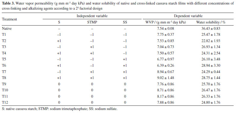 Marisa Ferreira KarowI; Karine Laste MacagnanII I. Departamento de Ciência e Tecnologia de Alimentos, Faculdade de Agronomia Eliseu Maciel, Universidade Federal de Pelotas, 96160-000 Pelotas - RS, Brasil Received: 04/30/2024 *e-mail: angelitadasilveiramoreira@gmail.com Films based on pure native starch have limited applications, are easily breakable, very hygroscopic, and permeable to water vapor. One method for improving these properties is to modify starch by cross-linking. The aim was to evaluate the effect of the addition of sodium trimetaphosphate (STMP), sodium sulfate (SS) and native cassava starch (S) on the properties of modified cassava starch films using a 23 factorial design comparing the concentration of the crosslinkers (5.0, 12.5 and 20% STMP), SS (3.0, 9.0 and 15%) and native cassava starch (S) (5.0, 7.5 and 10%) m/v. All cross-linked cassava starch films had better easiness of handling, continuity, and brightness than the control film. Generally, cross-linking reduced the water solubility and tensile strength and increased thickness, elongation and the films' yellowish color and opacity. Reagents' concentration affected most of the dependent variables. The SMTP*SS interaction positively affected water vapor permeability (WVP), while negatively affected solubility. Tensile strength was positively affected by SMTP. As for elongation, the S*SS interaction was positive, while the effect of STMP*SS was negative. Treatment 1, using the lowest concentrations of reagents, presented positive results, such as excellent macro and microscopic appearance. These findings also qualify the crosslinked starch for use in coatings formulations. INTRODUCTION Biodegradable films were developed to minimize environmental damage caused by traditional non-biodegradable plastic materials, which are widely used in packaging including for foods.1 Biodegradable or edible films and coatings are among the new environmentally-friendly methods for post-harvest conservation of fresh fruits, minimally processed or processed by dehydration.2,3 To be suitable for food packaging, biodegradable films must be non-toxic and have certain essential characteristics, such as low hygroscopicity, selective permeability to gases and water vapor, as well as good mechanical properties such as elongation and tensile strength. And, preferably, they must have low cost.4 The coatings are applied or formed directly on the surfaces of fruits, forming thin membranes that are normally imperceptible to the naked eye and having various structural characteristics, which are dependent on the formulation of the film-forming solution.5 The coating should prevent excessive water loss or gain, reduce microbial proliferation and provide selective gas permeability (CO2 and O2).6 As these coatings become part of the consumed food, the materials used must be GRAS (generally recognized as safe), that is, they must be non-polluting, non-toxic, safe for use in foods, and inexpensive.7,8 Starches are among the most abundant organic materials in nature, and these polysaccharides have numerous industrial applications.9 They are widely used as powders for providing viscosifying, gelling and stabilizing agents. They have also been employed for making films and coatings of variable purposes,10 but some main features of the native forms limit their applicability. Cassava starch is extracted from the Manihot esculenta Crantz plant. It is also known as starch or manioc powder; it is a fine, white, odorless and tasteless powder. Cassava is known for its rapid growth, especially in tropical countries. However, its characteristics vary significantly depending on geographical location, cultivated variety, and plant age.11,12 Cassava starch typically contains 17% amylose and 83% amylopectin, this ratio being crucial for its physicochemical properties.12 Previously used as a filler material for producing eco-friendly and cost-effective plastic materials, starch now plays a crucial role as a raw material in various industries such as plastics, paper, textiles, and food packaging.13,14 Despite its benefits in terms of its biodegradability, biocompatibility, toxicity and cost-benefit ratio, starch does not fully meet the properties required for protective food coatings, particularly with regard to its poor mechanical performance.15,16 Native starch films and coatings are also typically very soluble and provide poor vapor barriers. To improve or adapt these properties, starch can be subjected to modifications that increase its applications and value.10,17-19 Modified starches have been used to develop biodegradable coatings and films for food packaging, as they represent improvements in the physical, chemical, morphological and mechanical properties compared to those made from native starch.18,20 Chemical modifications involve reactions including etherification, esterification, crosslinking, grafting or decomposition21 for addition of functional groups to starch. Cross-linking is one of the most important chemical modifications applied to polymers, including starch. The cross-linking of polymers is a process that occurs when linear or branched polymer chains are interconnected. Connections between the linear molecules produce high molecular weight three-dimensional polymers.22,23 Crosslinking agents are low-molecular mass molecules, preferably having at least two reactive functional groups enabling forming a bridge between polymer chains.24 For polysaccharide crosslinking, various agents are used, including boric acid,25 ferulic acid,26 and glutaraldehyde.27 One useful agent is sodium trimetaphosphate (SMTP), widely employed for its low toxicity, low cost and high reactivity. It reacts by replacing a few hydroxyl groups from starch, imparting anionic features to it - phosphate groups; it renders possible to obtain materials having properties improved both relative to those of natural starch and of enlarged application.28 Sodium sulfate (SS) is an alkalizing ag