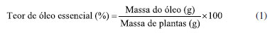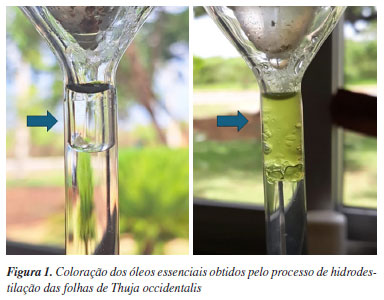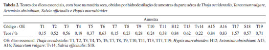 Os teores dos óleos obtidos apresentaram variação de 0,15 a 1,57%, conforme descrito na Tabela 2. O maior teor 1,57% foi obtido na amostra T. occidentalis (T17), enquanto o menor teor 0,15% foi obtido em amostra de T. occidentalis (T1 e T7), indicando variabilidade no teor de óleos essenciais para a espécie pertencente à família Cupressaceae. A mesma variação foi observada nas famílias Asteraceae (T. vulgare e A. absinthium), teores de 0,22 à 0,84%, e Lamiaceae (H. marrubioides e S. officinalis) com teores de 0,84 e 0,57%, respectivamente.