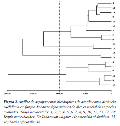 O estudo foi conduzido no Laboratório de Plantas Medicinais do Centro de Pesquisa em Ciências Agrárias do Instituto de Ciências Agrárias da Universidade Federal de Minas Gerais (CPCA-UFMG) (16º41'05"S 43º50'37"W), no período de setembro/2021 a outubro/2022. O projeto foi registrado no SisGen (Sistema Nacional de Gestão do Patrimônio Genético e do Conhecimento Tradicional Associado) sob o número A0AC958, devido ao acesso ao patrimônio genético brasileiro. Extração do óleo essencial As amostras de folhas de todas as cinco espécies de plantas foram secas em estufa a 45 ºC e armazenadas em sacos de polietileno ao abrigo da luz até o momento da extração. O óleo essencial foi extraído das folhas por hidrodestilação, com aparelho tipo Clevenger, durante duas horas.6 Os óleos essenciais extraídos, em razão de sua menor densidade em comparação à água, foram coletados do sistema utilizando uma pipeta de Pasteur, assegurando a completa ausência de traços de água. Após a separação total da fase aquosa, o óleo essencial foi transferido para frascos de vidro âmbar, pesados e armazenados a uma temperatura de -8 ºC. Antes de seu envio para análise, foi realizada a verificação para confirmar a ausência de qualquer contaminação por água. Os óleos essenciais de Thuja occidentalis receberam os códigos T1, T2, T3, T4, T5, T6, T7, T8, T9, T10, T11, T13, T17, T19; Hyptis marrubioides, H12; Artemisia absinthium, A15, A16; Tanacetum vulgare, TV14; Salvia officinalis, S18. O teor de óleo (%) foi calculado com base na matéria seca pela expressão: ![]() Análise CG-EM e composição química dos óleos essenciais A análise química do óleo essencial foi realizada no Laboratório de Química Instrumental do ICA/UFMG, utilizando cromatografia gasosa acoplada a espectrometria de massas (CG-EM), sendo o analisador do tipo quadrupolo. As amostras foram diluídas em diclorometano (1 mg mL-1), transferidas para vials (2 mL) e analisadas individualmente, em coluna capilar de sílica fundida DB-5 MS (30 m × 0,25 mm × 0,25 μm) e hélio (fluxo 1 mL min-1) como gás de arraste. A programação da temperatura foi de 60 a 240 ºC, com incremento de 3 ºC min-1. O sistema foi operado no modo scan (monitoramento), com impacto eletrônico a 70 eV, em faixa de 45 a 550 (m/z). Foi injetada a série padrão de n-alcanos C7 a C40 (Sigma-Aldrich), nas mesmas condições para o cálculo do índice de retenção (IR). Os dados gerados foram analisados e os compostos identificados com o uso do software MSD ChemStation (E.02.021431 Copyright© 1989-2011, Agilent Technologies, EUA), juntamente com a biblioteca National Institute of Standards and Technology,7 comparados com informações da literatura8 e com o IR do composto. A abundância relativa (%) dos íons totais referentes aos compostos foi calculada, a partir da área de pico do cromatograma e organizada de acordo com a ordem de eluição. O IR calculado foi realizado de acordo com van den Dool e Kratz.9 Análises estatísticas Para análise da composição química do óleo essencial foi empregada a análise multivariada, com o auxílio da plataforma estatística MetaboAnalistyR 5.0.10 Devido à heterogeneidade das amostras, os resultados foram submetidos à análise de componentes principais (ACP) e de agrupamentos hierárquicos (AAH), com base na distância euclidiana.