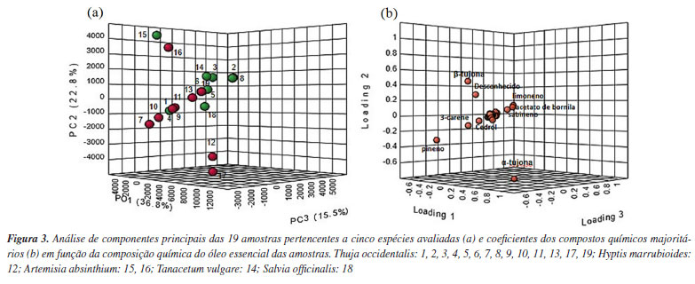 Assim, o PC1 correlacionou-se positivamente com a α-tujona, sendo este o composto majoritário encontrado nas amostras 12 e 17, que correspondem às espécies H. marrubioides Epling, Tiradentes/MG (H12) e T. occidentalis, Pouso Alegre/MG (T17), correspondendo ao grupo II, evidenciando assim a similaridade existente entre os óleos essenciais dessas duas espécies. A PC2 correlacionou-se positivamente com β-tujona, encontrado em maior proporção relativa nas amostras 15 e 16, grupo III, que correspondem às amostras de losna (Artemisia absinthium L.: A15 e A16) avaliadas neste estudo. Além da presença desse composto, o perfil químico dessas amostras é semelhante. Ademais, vale ressaltar que a análise cromatográfica apresentada na Tabela 3 apresentou um composto com teor superior ao β-tujona, com 39,30% (composto No. 26) com índice de retenção calculado de 1129. Esse foi o único composto no qual não foi possível a sua identificação dentre os 83 ativos químicos presentes nas 19 amostras de óleos analisadas. A PC3 correlacionou-se positivamente com os compostos limoneno, acetato de bornila e sabineno sendo que esse grupo é compostos por três espécies, Salvia officinalis L. (S18), Tanacetum vulgare L. (Tv14) e T. occidentalis (T2 e T8). Essa correlação foi positiva para T2 e T8, onde os três compostos foram os majoritários, em que o limoneno apresentou, em T8, 29,07% e, em T2, 20,25%; o acetato de bornila apresentou, em T2, 29,68% e, em T8, 28,44%; e o sabineno apresentou em T2 20,39% e T8 5,83%, respectivamente. Enquanto que para TV14 houve relação positiva direta com o sabineno, seu composto majoritário (29,27%); o limoneno apresentou 0,36% e o acetado de bornila foi ausente na amostra dessa espécie. O conteúdo dos compostos α-tujona e β-tujona, selecionados como marcadores do presente estudo apresentou variação entre as amostras. A variação química identificada nas análises dos óleos essenciais pode ser explicada por diversos fatores, como avaliação de espécies diferentes, plantas em estádios de desenvolvimento distintos, local de coleta e, ou, obtenção das amostras, época de coleta, possível presença de quimiotipos.31 Németh e Nguyen31 apresentaram um levantamento sobre a tujona para quatro espécies que também compõe esse estudo (Artemisia absinthium,Salvia officinalis,Tanacetum vulgare, Thuja occidentalis), e evidenciaram a ocorrência de variabilidade química, intra e interespecífica, podendo haver oscilações no conteúdo de tujona, e ainda quanto à sua presença nos óleos essenciais. Ademais, os autores sugerem que a tujona poderia ser um marcador quimiotaxonômico. Quanto à T. occidentallis, os autores relatam que a tujona é o composto dominante do gênero Thuja sp. e que de maneira geral ainda não haviam sido relatados estudos em que o composto não foi detectado, como observado no presente estudo, onde foram registradas amostras totalmente livres de tujonas ou com níveis não detectáveis. Portanto, a realização de estudos que elucidem a composição química de diferentes espécies em mesmas condições de análises se faz cada vez mais necessários, possibilitando a comparação e indicação das potencialidades das espécies e seus óleos essenciais. Além disso, estudos de espécies locais e, ou, do comportamento de espécies com potencial econômico e farmacológico, permitem o desenvolvimento de manejos eficientes e a exploração de novos mercados.