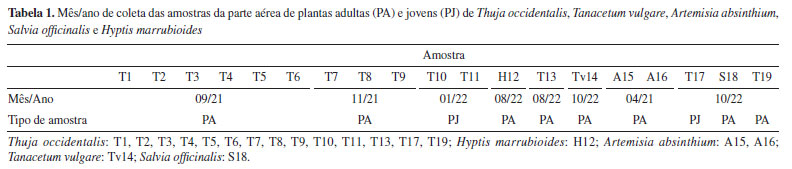 PARTE EXPERIMENTAL Seleção e obtenção do material vegetal Foram selecionadas espécies vegetais que contêm os marcadores químicos α-tujona e β-tujona para o presente estudo. Inicialmente, foram utilizadas plantas jovens e adultas de Thuja occidentalis L. (Cupressaceae), por apresentarem teores desses compostos, que atendem aos requisitos da indústria farmacêutica. Adicionalmente, com o objetivo de identificar possíveis fontes alternativas dos compostos em questão, foram analisadas amostras de Artemisia absinthium L. (Asteraceae), Hyptis marrubioides Epling (Lamiaceae) - depósito MCCA 5711, Salvia officinalis L. (Lamiaceae) e Tanacetum vulgare L. (Asteraceae), totalizando 19 amostras, conforme descrito na Tabela 1.