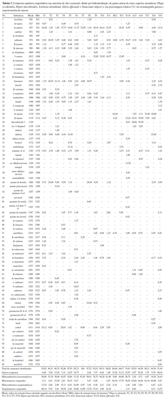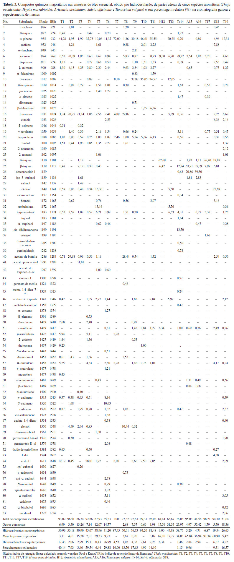 O conteúdo de óleos essenciais presentes nas plantas é influenciado por múltiplos fatores como idade da planta, aspectos nutricionais, modo de coleta, secagem/armazenamento, ataque de patógenos, condições climáticas etc. Assim, os teores podem sofrer variações em espécies distintas ou dentro de uma mesma população.11 A quantificação do teor de óleo em espécies medicinais permite seu emprego como matéria-prima e possibilidade de avançar em etapas posteriores à bioprospecção, espécies com maiores rendimentos são preferencialmente empregadas. A análise da composição química, dos óleos essenciais obtidos das amostras avaliadas, possibilitou a identificação de 82 compostos (Tabela 3). De forma geral, os constituintes presentes nos óleos pertencem à classe dos terpenos, com prevalência de hidrocarbonetos monoterpênicos (3,20-94,20%) e monoterpenos oxigenados (0,20-91,34%), hidrocarbonetos sesquiterpênicos (0,43-26,99%) e sesquiterpenos oxigenados (0,96-59,54%). Os compostos identificados com maior abundância nas amostras foram α-tujona, β-tujona, α-pineno, sabineno, 3-careno, limoneno, cânfora, acetato de bornila, acetato de trans-pinocarvil, conforme demostrado na Tabela 3.