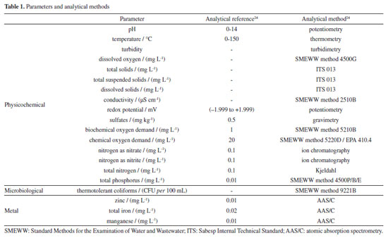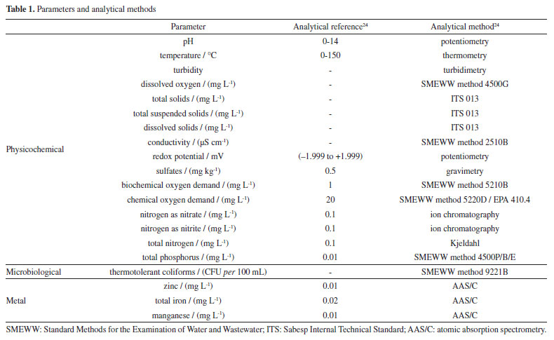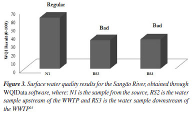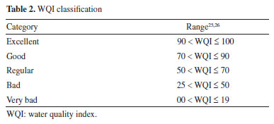 Evaluation of the water quality index (WQI) Monitoring water quality is essential to identify the level of degradation of the water body. The WQI is a mathematical tool that integrates several parameters and transforms them into an expression of the water quality index. To evaluate and characterize the WQI of the Sangão River, the National Sanitation Foundation Water Quality Index (WQI-NSF) was determined. This index was developed by the National Sanitation Foundation (NSF) of the United States.23 It is calculated from the results of nine physicochemical and microbiological parameters. For each parameter, average curves of the variation of the water quality were drawn as a function of their respective concentrations and a weight was assigned according to its relative importance in the WQI calculation. WQIData software25 was used to determine the results. Raw water quality, indicated by the WQI, varies on a scale of 0 to 100.25,26 The classification is shown in Table 2.