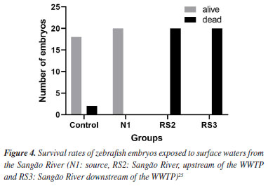 Through the WQI results, it is clear that surface water quality from the Sangão River is impacted from its source onward. Although sample N1 had a 'regular' overall result, analysis by WQIData showed that thermotolerant coliform and turbidity parameters represent particular factors that contribute to lower water quality at the site, with their contribution to the classification based upon data that point to the presence of values over 50% of thermotolerant coliforms and between 10 and 24% turbidity. It may be that management conditions at the site influenced the results, as the N1 samples were collected in a field containing livestock, so contamination by coliform bacteria is likely. Alongside such contamination, livestock activities promote the entry of sediments and ions into the water, due to the impact of cattle passage and an associated reduction in forested areas, which can explain the involvement of the turbidity parameter as a factor impacting water quality at the site, although its result was within the established limits of the CONAMA.23 WQI classifications at points RS2 and RS3 were 'bad'. According to data obtained with WQIData, the factors that contributed to the unsatisfactory quality index in both samples were low dissolved oxygen values and pH, where these parameters contributed between 25-50% weighting to the classification as 'bad'. The low dissolved oxygen values and the high thermotolerant coliform concentrations can be explained due to the volume of sewage that is discharged into the Sangão River, while the low pH can be explained by mining activities during the economic expansion of the municipality. Acute ecotoxicological study with zebrafish embryos In addition to physicochemical parameters, living organisms can be used as bioindicators of environmental quality. In this context, zebrafish have been widely used as an interesting model for monitoring organic pollutants as well as for evaluating certain contaminants in water quality studies.27 Although it was expected that embryos of RS2 and RS3 groups would not survive the entire experimental process due to the poor water conditions already evidenced through physicochemical, microbiological and metal parameters as well as by WQI, we tried to ratify this information and compare with the N1 sample (Figure 4).