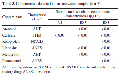 RESULTS AND DISCUSSION Detection of pharmaceutical contaminants Of the 301 compounds detectable via SPE-LC-Q-TOF-MS, 118 were validated and their presence in the samples was evaluated. Table 3 presents the average results of the samples analyzed in triplicate, and indicate the presence or absence of these contaminants in each of the analyzed samples. The methodology evaluated the presence of these compounds at three concentration levels: 0.01; 0.1 and 1.0 µg L-1. As the analysis was quantitative, the results are expressed as a concentration range, with only six of 118 compounds identified, all at levels lower than 0.01 µg L-1.