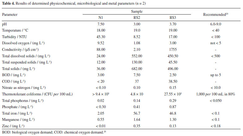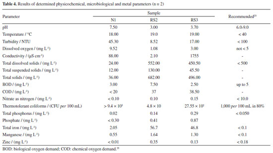 Among various therapeutic classes investigated, six individual contaminants were found, belonging to antihypertensive (2), stimulant (1), nonsteroidal anti-inflammatory (2) and anesthetic (1) classes. One of the main routes for pharmaceutical contaminants to enter the environment is due to the direct discharge of domestic sewage into water bodies. Although the source of the river suffers from anthropic actions, mainly through cattle raising activities, the degree of contamination was lower when compared to the Sangão River extension cutting through the urban areas of Siderópolis and Criciúma. These cities had their economic and population growth linked mainly to coal exploration. And this unplanned growth caused negative impacts on the quality of the Sangão River, as it is affected by the release of domestic sewage, mainly from the city of Criciúma. Also, the absence of further contaminants in the spring may reflect their presence in quantities below the detection limits of the equipment, which was 0.01 µg L-1. Caffeine was the only substance found in all analyzed samples, also being the only one detected in the source sample. Although a potential pharmaceutical contaminant, it is more likely that the widespread consumption of products containing caffeine in foods and beverages explains its wide occurrence. This substance is commonly used as an indicator of anthropogenic activity in natural environments, as its presence is directly related to the entry of untreated domestic sewage into environmental compartments.9 The local anesthetic lidocaine was detected in RS2 and RS3 samples. This aligns with studies28 conducted in China, where the presence of lidocaine was noted in all surface water samples analyzed from three rivers, at an average concentration of 0.098 µg L-1. Similarly, in Greece, lidocaine was detected in seawater with a high detection frequency (> 90%) and in a maximum concentration of up to 0.0128 µg L-1.29 As 90% of the consumed dose of lidocaine is metabolized, with only 10% released unchanged into the environment,30 the presence of this substance in the analyzed samples may be related to the improper disposal of drugs into the sewage system. Studies conducted by Mandaric et al.31 found that anti-inflammatory drugs were the most frequently detected compounds in treated and untreated wastewater in Spain, assigning this contamination to the ease of access to this therapeutic class, as, for the most part, these are commercialized without medical prescription and widely used in self-medication practices. In this work, the NSAID ketoprofen, along with the related drug paracetamol, was detected in RS3 samples. The presence and persistence of ketoprofen in wastewater after WWTP treatment has been previously described.32 Similarly, paracetamol is a drug widely used for its analgesic and antipyretic properties. The liver, and to a lesser extent, kidney and intestine, are the main organs involved in its metabolism. After ingestion, about 80 to 90% of paracetamol is converted into pharmacologically inactive metabolites and eliminated via the urinary tract.33 Its presence in analyzed samples may thus reflect improper disposal. The antihypertensive drugs atenolol and metoprolol were detected in both RS2 and RS3 samples. According to Godoy et al.,34 these beta-blockers are the most commonly detected drugs in aquatic environments, because they are among the most consumed drugs worldwide. A study35 of several organic pollutants in surface waters across the USA found an atenolol concentration of 0.0019 µg L-1 and a metoprolol concentration of 0.0043 µg L-1. In a study36 in the Jundiaí River (São Paulo, Brazil), the mean atenolol concentration detected ranged between 0.22 and 0.43 µg L-1. Rates of human metabolism vary widely for this therapeutic class. For example, atenolol is excreted practically unaltered (> 96%), which may explain its detection in analyzed samples. However, the presence of metoprolol may reflect its inadequate disposal through the sewage system, as it has high rates of metabolism and is thus not expected to be detected.34 Physicochemical, microbiological and metal parameters The average results of physicochemical, microbiological and metal parameters are shown in Table 4.
