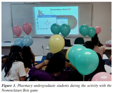 Later, we encouraged the students to study together before the activity day, when they would not have any direct support from the members of their group. Although the activity had an individual character, that is, only one student would win the activity and be rewarded with one extra point in their grade, all students from the winner's group would also be rewarded with a half-point in their grades to foster partnership. Activity day Initially, each group member attached two balloons with their group colors to their head with the help of an elastic band and two plastic rods (Figure 1 and Figure 1S, see Supplementary Material). The time spent for this preliminary preparation was 15 min on average. Next, the Professor projected the Nomenclature Bets 2.0 game10 screen on a whiteboard (Figure 1 and Figure 2S, see Supplementary Material). It is essential to highlight that the students did not sit near each other members of their groups because no exchange of answers was permitted among them during the activity. The steps of Popping Balloons are listed below: