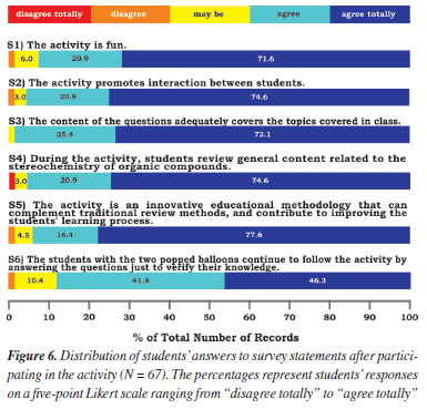 RESULTS AND DISCUSSION Evaluation of the activity - students' opinions We invited the 67 students (28 undergraduate and 39 high school) who participated in the Popping Balloons activity to respond to a survey of twenty-one statements using a Likert-type scale34 (see Supplementary Material). All Pharmacy students agreed to participate and signed the Informed Consent Form we provided (see Supplementary Material). Also, the high school students agreed, and their parents signed the Assent Form we provided (see Supplementary Material). The first six statements (S1-S6) refer to the activity as a tool to review the nomenclature of organic compounds (for undergraduate students) or Stereochemistry (for high school students). The following twelve statements (S7-S18) refer to the User Engagement Scale short form (UES-SF),35 one of the best-known and most straightforward methods of ascertaining participant engagement levels in an activity. The last three statements request a rate for the activity and its positive and negative aspects (S19-S21). Based on student responses (Figure 6), we can confidently affirm that they enjoyed the Popping Balloons activity, with agreement rates to the statements ranging from 88.1 to 98.5%. In addition, the findings showed that 92.5% of students considered the activity fun (S1). 95.5% agreed that the activity promotes interaction between students (S2) while reviewing content related to the nomenclature or stereochemistry of organic compounds (S3, 98.5%) because the games adequately cover the subjects seen in class (S4, 95.5%). Also, 94.0% agreed that the activity is an innovative educational methodology that can complement traditional review methods and improve the student learning process (S5). Finally, 88.1% of the students agreed that those who had their two balloons popped during the activity continued to follow its dynamics by answering the questions to test their knowledge (S6).