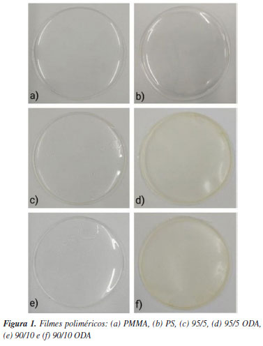 RESULTADOS E DISCUSSÃO Estudo das propriedades dos filmes de PMMA, PS e blendas PMMA/PS com e sem ODA Aspectos morfológicos Na Figura 1 são mostrados os filmes obtidos para os polímeros e blendas deste estudo. Os filmes de PMMA, PS e das blendas PMMA/PS foram obtidos pelo método casting, apresentando-se macroscopicamente homogêneos e sem fissuras. A espessura média dos filmes foi de 0,2 mm; sem alterações significativas para as blendas com e sem a adição do ODA. Pode-se observar na Figura 1, no entanto, que os filmes das blendas com ODA mostraram um aspecto mais opaco.