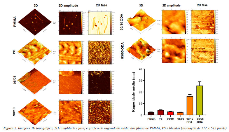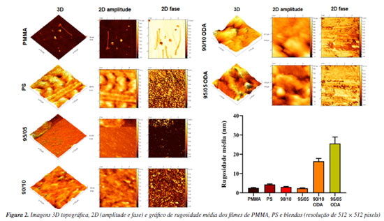 A Figura 2 mostra a morfologia da rugosidade da superfície dos filmes testados via técnica de MFA. A rugosidade da superfície varia de acordo com a natureza do material. É possível observar diferentes construções na estrutura morfológica das superfícies das amostras pelas imagens (3D e 2D) e as menores rugosidades média (Ra) para os homopolímeros e blendas sem ODA. A amostra de PMMA (Ra = 2,51 ± 0,29 nm) é mais lisa do que a do PS (Ra = 4,33 ± 0,31 nm). Contudo, a rugosidade dos filmes com ODA superam o valor de 20 nm.