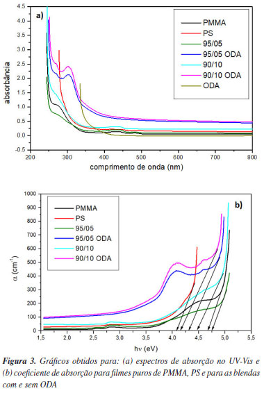 A mistura de ODA às blendas pode levar a formação de modificações na estrutura do filme que aumentam, por consequência, a rugosidade das amostras.46 A maior rugosidade dos filmes com ODA pode ter sido responsável pela opacidade dos filmes (Figura 1), devido a modificações de configuração das cadeias poliméricas pela ação do surfactante. Tais modificações geraram um diferente comportamento óptico no material. O aumento de rugosidade pode proporcionar às blendas com ODA uma característica importante que modula as interações entre o meio e a interface do material. A magnitude desta propriedade define a tendência de adesão superficial que tem aplicações importantes como em sínteses, materiais com resistência à corrosão e na produção de próteses, por exemplo.30 Análises dos espectros no UV-Vis A Figura 3 apresenta os espectros de absorção na região do UV-Vis para os filmes de PMMA, PS, blendas de PMMA/PS (com e sem ODA) e para o ODA puro. Na Figura 3a, a absorbância na faixa entre 250 e 300 nm é relacionada com a transição eletrônica do tipo π-π*. O filme PMMA apresentou absorção em torno de 270 nm, referente ao grupo C=O47,48 e o PS em 280 nm referente às ligações C=C do grupo aromático.48 As blendas apresentaram absorções próximas do PMMA, que é o polímero majoritário na mistura.
