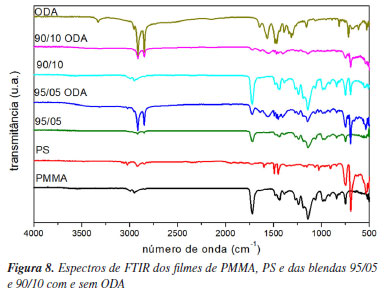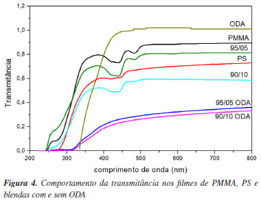 O ODA apresenta uma banda de absorção em 350 nm. Nas blendas com ODA também foi observada uma banda de absorção em torno de 330 nm. Tais bandas são associadas às transições do tipo n→π* que requerem energia relativamente baixa e, portanto, ocorrem em comprimentos de onda mais altos como mostrado na Figura 3a. Para o ODA a transição é referente aos elétrons do grupo amina. Para as blendas com ODA, a transição pode estar relacionada com as interações entre os elétrons do surfactante e do grupo C=O do PMMA ou C=C do PS.49 O coeficiente de absorção óptica (α) reflete a capacidade de absorção de luz pelos materiais. A interseção da extrapolação da parte linear e o eixo horizontal do gráfico α versus hn fornece uma estimativa da energia do fóton absorvido pelo filme (Figura 3b). A blenda 90/10 e as blendas com ODA apresentaram uma energia intermediária entre o PMMA e o PS. Entretanto as blendas com ODA apresentaram as menores energias de absorção quando comparadas com o PMMA, que é o polímero majoritário na mistura. A diminuição de 4,68 eV do PMMA para 4,33 e 4,15 eV para as blendas 95/05 e 90/10 com ODA, respectivamente, são evidências da ocorrência de mudanças na estrutura de bandas de absorção (valência e condutora) das amostras pela ação do surfactante no sistema.50 A partir dos valores de absorbância obtidos no espectro de UV-Vis (Figura 3a) foi realizado o cálculo da transmitância (T) cujos resultados são apresentados na Figura 4. A amostra de PMMA apresentou um valor T superior a 0,8; ou seja, transmitância superior a 80% e a amostra de PS apresentou um valor T superior a 0,7. Entretanto, os filmes das blendas apresentaram diminuição de T, com significativa diminuição para as blendas com ODA (menor que 40%).