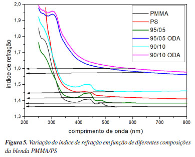Esse resultado corrobora com os resultados obtidos nas fotos dos filmes apresentadas na Figura 1 que mostra os filmes de blendas com ODA mais opacos, além da maior rugosidade (Figura 2). Cabe salientar o valor de transmitância próximo de 1,0 para o ODA, ou seja, o surfactante apresenta alta transparência. A Figura 5 mostra o comportamento do índice de refração dos sistemas estudados. O índice de refração em um material não magnético é dependente da constante dielétrica e outros fatores como a temperatura ou a adição de outras substâncias ao sistema, por exemplo. Analisando a Figura 5, nota-se que o índice de refração exibiu uma região de dispersão em comprimentos de onda baixos (250 a 500 nm) enquanto quase estabiliza em comprimentos de onda acima de 500 nm do espectro. A ampla dispersão do índice de refração na região de menor comprimento de onda do espectro é atribuída à polarização das moléculas devido a variação de força das cargas internas pelo campo magnético da luz.51 Por outro lado, na região de maior comprimento de onda, as moléculas polarizadas não são capazes de seguir a alternância de campo devido à sua inércia.52