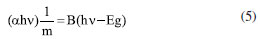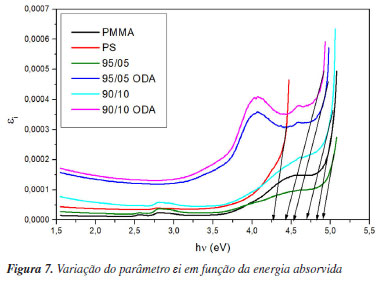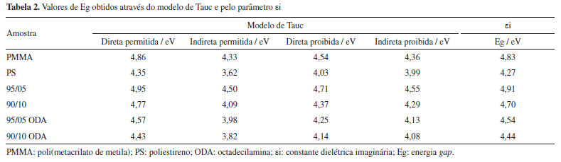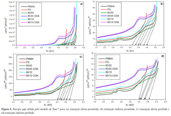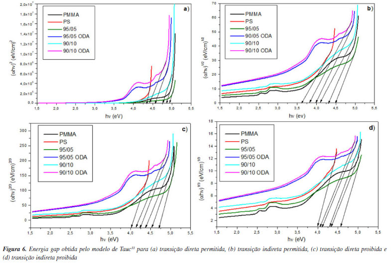 No comprimento de onda de 600 nm, que está na faixa de linearidade das curvas, foram encontrados os valores 1,36 e 1,41 para o PMMA e o PS, respectivamente. A blenda 95/05 apresentou um valor próximo ao do PMMA (1,38), enquanto que a blenda 90/10, apresentou um valor muito do próximo do PS (1,44). Ainda assim, o surfactante teve um impacto interessante no índice de refração das blendas, que apresentaram valores superiores a 1,5 com destaque para a blenda 90/10 ODA (1,6). O índice de refração depende tanto da densidade quanto da polarizabilidade. Portanto, a adição do ODA ao sistema parece introduzir mais portadores de carga na blenda. Consequentemente, maior densidade e mais moléculas polarizáveis existirão e resultarão em um índice de refração mais alto de acordo com a fórmula de Lorentz-Lorenz.53 Em comparação com sólidos inorgânicos, as aplicações ópticas de polímeros são frequentemente limitadas devido à faixa relativamente estreita do índice de refração. Contudo, os resultados deste estudo mostraram o potencial das blendas com ODA como materiais ópticos com ajuste do índice de refração. O ODA também impactou a Eg dos sistemas. Na Figura 3b o deslocamento para a absorção de energia mais baixas do fóton revela a redução no gap óptico das blendas com ODA. A fim de encontrar a transição predominante dos sistemas, foram obtidos os valores Eg pelo modelo de Tauc (Figura 6) que foram comparados com a energia obtida através do parâmetro εi (Figura 7). Na Tabela 2 estão dispostos os valores de Eg obtidos através das Figura 6 e 7. Os resultados sugerem que a transição eletrônica predominante em todos os sistemas é a direta permitida, dada a similaridade dos valores de tal transição e de εi. No que diz respeito às aplicações, diodos emissores de luz (LEDs), energia fotovoltaica e diodos laser, por exemplo, são produzidos a base de materiais que apresentam Eg direto.54
