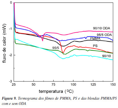 Analisando a Figura 8 é possível constatar uma sobreposição de bandas dos homopolímeros nos espectros das blendas. Além disso, nos espectros das blendas com ODA, são observadas bandas provenientes da sobreposição com o surfactante. Contudo, não há deslocamentos de bandas nos espectros das blendas, ou seja, as interações entre o PMMA e o PS nas proporções estudadas parecem ser fracas ou inexistentes. Análises térmicas A Figura 9 mostra os termogramas dos filmes de PMMA, PS e das blendas com e sem ODA, cujos valores da temperatura de transição vítrea (Tg) estão especificados na Tabela 3. Os dados mostraram que os valores de Tg do PMMA, do PS e das blendas sem ODA são muito próximos.