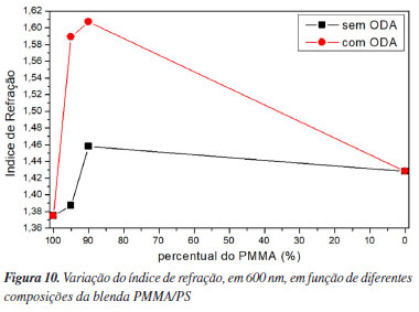 Por outro lado, as propriedades mecânicas das blendas poliméricas são determinadas pela contribuição de cada um dos componentes, da morfologia que assumem e da adesão interfacial entre ambos. Mudanças no alongamento, na ruptura e no módulo de elasticidade são indicativos da adesão entre as fases da blenda, uma vez que são propriedades sensíveis à transferência de carga entre os componentes. No caso do módulo de elasticidade, ele é altamente dependente da natureza da ligação química do material, bem como a forma do poço de potencial versus a distância interatômica e das estruturas eletrônicas presentes. Já a tensão máxima está relacionada com a morfologia, tamanho dos domínios e a homogeneidade da blenda. Tamanhos de partícula menores refletem em um aumento na tensão máxima devido à maior transferência de carga entre as fases.57 Ao analisar os resultados foi possível observar que os valores do módulo de elasticidade e da tensão na força máxima do PMMA e das blendas sem ODA não apresentaram mudanças estatísticas, o que pode indicar que não houve relevantes alterações nas ligações químicas, bem como em aspectos macroscópicos. Contudo, uma leve diminuição no alongamento na ruptura foi registrada. Este resultado mostrou que a adição de PS, nas proporções testadas, não causou mudanças significativas nas propriedades mecânicas do PMMA na blenda. Nas blendas com o ODA foi possível observar uma tendência de diminuição nos valores do módulo de elasticidade e da tensão na força máxima, reforçando a capacidade do ODA em influenciar na distribuição das cadeias poliméricas, entretanto, sem mudanças estatísticas para o alongamento na ruptura. Estes resultados sugerem que a interação interfacial dos polímeros na mistura existe, mas é fraca, conforme já discutido nos espectros de FTIR (Figura 8). Essa configuração, leva a baixa transferência de tensão na interface ocasionando uma menor tensão na força máxima e um menor módulo de elasticidade nos sistemas com ODA.57 Estudo da miscibilidade das blendas Índice de refração e análise térmica Uma blenda é considerada miscível, pela análise do índice de refração, quando há uma linearidade entre os valores obtidos experimentalmente em função da composição da blenda.58 Os dados da Figura 10 foram selecionados a partir da Figura 5, no comprimento de onda de 600 nm. A variação dos índices de refração em função das composições das blendas PMMA/PS (com e sem ODA) não se apresentaram de forma linear, ou seja, os sistemas são imiscíveis segundo esta técnica. Portanto, as blendas apresentam diferentes fases e, por conseguinte, diferentes índices de refração para cada uma delas.