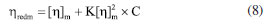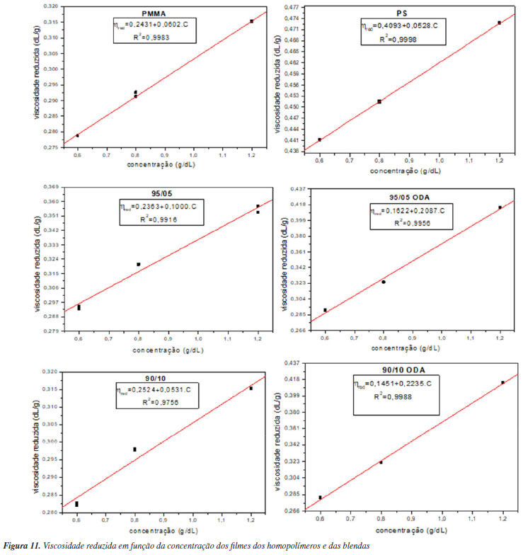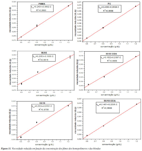 A miscibilidade de uma blenda polimérica também pode ser analisada através do termograma obtido pela técnica de DSC. A observação de apenas uma Tg intermediária aos valores característicos de cada homopolímero, indica miscibilidade. Dois valores de transição no termograma indicam: (i) miscibilidade parcial quando os valores de Tg são diferentes das transições dos homopolímeros e (ii) imiscibilidade quando as transições das blendas são iguais aos dos homopolímeros constituintes.59 Ao analisar os sistemas sem ODA (Tabela 2), observou-se que as temperaturas de transição vítrea das blendas, do PMMA e do PS são muito semelhantes, ou seja, não foi possível identificar valores intermediários entre as Tg dos homopolímeros para as blendas. Assim, os resultados tornam a análise de miscibilidade, por essa técnica, inconclusiva para as blendas sem ODA. Por outro lado, as blendas com ODA apresentam valores de Tg menores do que os valores dos homopolímeros que nos faz infererir que não podemos tirar conclusões sobre a miscibilidade, mas que de alguma forma o ODA atua na interface dos homopolímeros dando às macromoléculas mais mobilidade, como já discutido através dos dados da Tabela 3. Viscosimetria A Figura 11 apresenta os gráficos da viscosidade reduzida em função da concentração para os filmes PMMA, PS e as blendas PMMA/PS com e sem ODA. Cada ponto se refere aos dados de duas soluções. O gráfico apresenta um modelo matemático linear, cuja equação da reta fornece parâmetros importantes. Sabe-se que quando se trata da análise da miscibilidade de blendas por viscosimetria, o parâmetro experimental (), tanto para os homopolímeros quanto para as blendas, é obtido pela declividade da reta (coeficiente angular). Já o coeficiente linear da reta fornece a viscosidade intrínseca ([η]). A equação da reta de cada sistema está apresentada na Figura 11.