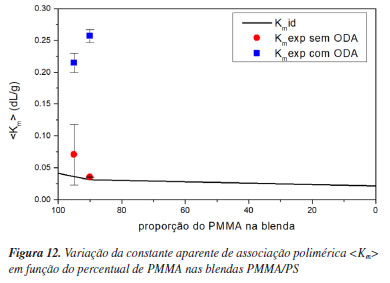 De acordo com Krigbaum e Wall,17 uma blenda polimérica é considerada miscível se Observando os dados da Tabela 5, verifica-se que para todas as blendas PMMA/PS, os parâmetros de miscibilidade, tanto para Krigbaum e Wall17 quanto para García et al.,18 apresentam valores negativos, indicando imiscibilidade nas proporções estudadas. Este resultado indica que o ODA não contribuiu para a miscibilidade da mistura polimérica. Ainda analisando os dados da Tabela 5, é possível inferir sobre o comportamento da viscosidade intrínseca, que é relacionada ao volume hidrodinâmico das cadeias poliméricas em solução. A viscosidade intrínseca das blendas sem ODA está muito próxima do valor obtido para o PMMA. Esse resultado é esperado uma vez que a quantidade de PMMA na blenda é majoritária. Contudo, as blendas com ODA apresentam uma diminuição significativa da viscosidade intrínseca. Supõe-se que a interação intermolecular entre os polímeros geralmente domina sobre as interações polímero-solvente.24 Assim, a atração entre os dois polímeros pode causar aumento do novelo randômico resultando em um aumento na viscosidade da solução. Já a diminuição na viscosidade da solução polimérica é obtida devido a repulsão entre as cadeias que causa o encolhimento do novelo randômico.61 Assim, esse resultado sugere que a molécula de ODA está promovendo uma contração no novelo polimérico devido à falta de afinidade química entre as moléculas. Isso pode explicar a razão do ODA não conseguir promover uma forte interação entre as moléculas de PMMA e PS e assim não promover a miscibilidade das blendas nas proporções estudadas. Os resultados obtidos através dos parâmetros ∆bKw e ∆bG corroboram os resultados obtidos através do índice de refração (Figura 10) e pela análise dos espectros de FTIR (Figura 8) que mostrou ser inexistente a interação intermolecular entre o PMMA e o PS nas blendas. O espectro de FTIR de uma blenda miscível é a superposição de três espectros: os espectros dos homopolímeros e um espectro que surge a partir da interação química ou física entre os homopolímeros, ou seja, um espectro com deslocamento de bandas. Já uma blenda imiscível exibe um espectro de FTIR que é apenas a superposição dos dois espectros dos homopolímeros.62 Ao analisar a Figura 8 foi observado que blendas, mesmo com o surfactante ODA, apresentam apenas espectros sobrepostos dos homopolímeros que, pela técnica, são consideradas imiscíveis. Entretanto, a Figura 12 mostra uma análise de miscibilidade por viscosimetria para as blendas com e sem o ODA utilizando a teoria de Pan et al.19 Os valores obtidos para as blendas sem ODA mostram que os valores de Km e 〈Km〉id estão muito próximos (90/10) ou dentro do desvio padrão (95/05) que indica que a associação dos polímeros é praticamente inexistente, ou seja, são soluções ideais. Contudo, observou-se um desvio positivo bem acentuado do valor experimental com relação ao valor ideal, para as blendas com ODA. O modelo de Pan et al.19 se baseia na teoria de agregados moleculares (formação de clusters), então os resultados obtidos para as blendas com ODA sugerem que houve uma associação polimérica que gerou a formação de agregados, provavelmente facilitada pela presença do ODA.