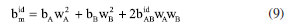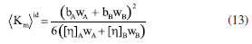 As soluções de cada concentração foram preparadas em triplicata e as concentrações utilizadas para as soluções de polímeros puros e de blendas com e sem o ODA foram de 0,6; 0,8 e 1,2 g dL-1. A declividade da reta obtida da correlação ηredm vs. C foi o parâmetro de miscibilidade experimental da mistura A obtenção de ![]() Sendo ηredm a viscosidade reduzida e [η]m a viscosidade intrínseca da mistura, considerando que em uma solução muito diluída uma molécula não sofre influência de outra no sistema. ![]() Na qual wA e wB são as frações em peso dos polímeros A e B. Os parâmetros bA, bB e bAB se referem aos parâmetros experimentais dos homopolímeros A, B e de uma mistura AB, respectivamente. ![]() Devido a dificuldade de se obter o parâmetro Através do método de García et al.18 foi obtido o parâmetro ![]() Nos dois modelos a diferença entre Utilizando o critério viscosimétrico proposto por Pan et al.19 a constante de associação aparente (Km) é calculada através da Equação 12. ![]() Considerando a mistura polimérica como um soluto simples, os dados de viscosidade da solução apresentam uma constante de associação ideal (〈Km〉id) obtida através da Equação 13. ![]() Segundo o critério de Pan et al.,19 para uma solução com a mistura de polímeros, o desvio positivo da constante de associação aparente experimental (Km) do seu valor ideal (〈Km〉id) pode ser considerado como uma indicação de interação atrativa entre os polímeros na solução, ou seja, a mistura é miscível. Por outro lado, o desvio negativo de Km do seu valor ideal indica que existem interações repulsivas entre os polímeros e isso significa imiscibilidade do sistema. A blenda é considerada "ideal" quando não há formação de agregados, isto é, Km ≈ 〈Km〉id. Neste estudo, além da técnica de viscosidade, a miscibilidade das blendas também foi avaliada através dos resultados obtidos pelas técnicas de análise térmica, FTIR e índice de refração que foram devidamente descritas nas seções anteriores.