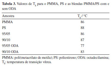 Por outro lado, as blendas com ODA apresentaram um pico e uma transição em temperaturas inferiores aos dos homopolímeros constituintes. Os picos entre 50-53 ºC que aparecem apenas nos termogramas das blendas com ODA são referentes ao ponto de fusão do surfactante.56 Já a Tg das blendas com ODA apareceram em temperaturas menores do que as dos homopolímeros. Dessa maneira, o ODA promoveu às cadeias poliméricas da fase amorfa da blenda maior mobilidade; isto é, que adquirissem mudança de conformação.14 Análises mecânicas A Tabela 4 mostra os resultados das propriedades mecânicas obtidas para os polímeros puros e para as blendas em estudo. Observa-se que o PMMA apresentou um maior valor de módulo de elasticidade e maior valor de tensão na força máxima quando comparados com os valores obtidos para o PS. Esses resultados significam maior rigidez do PMMA, embora o polímero apresente um maior alongamento na ruptura.
