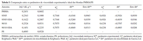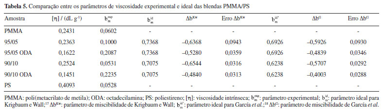 O parâmetro ideal, , para Krigbaum e Wall,17 é obtido por meio das Equações 8-10 e, o para García et al.18 é obtido por meio da Equação 11. Os parâmetros de miscibilidade de Krigbaum e Wall (∆bKw) e García et al. (∆bG) foram obtidos por meio da subtração entre os parâmetros experimental e ideal de cada modelo. A Tabela 5 mostra os parâmetros de miscibilidade das blendas PMMA/PS, com e sem o ODA, calculados segundo Krigbaum e Wall17 e García et al.,18 e os erros associados a cada um. Também são mostrados os coeficientes linear ([η]) e angular () das equações das retas mostradas na Figura 11. É possível observar um alto grau de coeficiente de correlação (R2), indicando uma consistência do comportamento linear.18
