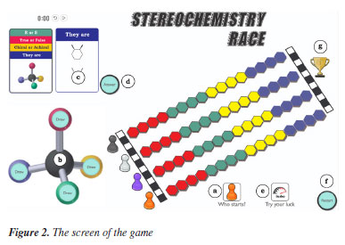 José Nunes da Silva JúniorI,* I. Departamento de Química Orgânica e Inorgânica, Universidade Federal do Ceará, 60451-970 Fortaleza -CE, Brasil Received: 10/31/2024 *e-mail: nunes.ufc@gmail.com This paper presents a Chemistry Team Game Tournament (TGT) as a didactic strategy to review stereochemistry concepts. For this purpose, a multilingual (English, Italian, French, and Portuguese) educational game, Stereochemistry Race, was developed on the online digital platform PlayingCards. The study involved the participation of 85 students from the following institutions: sixteen first-year Pharmacy students at the Federal University of Ceará (Brazil); twelve senior high school students at Colégio Maximus, in Fortaleza (Brazil); sixteen first-year Natural Sciences students and forty-one first-year Biotechnology students at the Università degli Studi di Genova (Italy). After the implementation of the tournament, the students evaluated the game, the match strategy, and their social and emotional interactions with their peers. To this end, data collection was carried out using a form that also included the UES-SF (User Engagement Scale-Short Form) engagement assessment model, which showed greater student participation and interest in stereochemistry studies than to traditional review classes. INTRODUCTION The study of the three-dimensional arrangement of atoms and molecules, known as stereochemistry, is fundamental to understanding the properties and reactivities of compounds. Its importance is highlighted in various fields, such as pharmaceutical chemistry, drug design, materials science, and organic synthesis. Stereochemistry is the foundation for understanding the structures of the fundamental building blocks that make up living organisms. These blocks include chiral compounds found in nature in enantiomerically pure forms, such as nucleotides, sugars, and α-amino acids.1 Different stereoisomers can exhibit variations in their biological activities, pharmacokinetic profiles, and mechanical properties, which directly affect their therapeutic effects. Stereochemistry plays a critical role in determining the structure, function, and activity of organic molecules, influencing their behavior in biological systems and chemical reactions. Mastery of this area by students is crucial for the pharmaceutical industry, as it helps avoid adverse effects caused by inactive or unsafe enantiomers present in racemic mixtures, ensuring greater safety and efficacy in drug development.2 However, stereochemistry is often considered a challenging discipline by many academics, primarily due to its complexity in three-dimensional visualization and the difficulty in assimilating fundamental concepts such as asymmetric carbon and chirality. These barriers may lead to unsatisfactory student performance and the development of misconceptions, hindering progress in various academic careers that rely on this knowledge.2-4 Therefore, since the 1940s, educators have sought different strategies to represent the positions of stereochemical groups on the plane of the blackboard, attempting to facilitate three-dimensional visualization. If these limitations are not overcome, academic and professional development in fields that require a solid understanding of stereochemistry, such as chemistry, biochemistry, and pharmacology, may be seriously impacted.5,6 In this context, educators and researchers in educational games have also dedicated themselves to studies demonstrating that games can be effective tools for presenting and representing concepts and promoting the learning process. This approach generally creates a more engaging classroom environment, increasing students' attention, encouraging interaction, and boosting learning motivation.3-13 Game-based learning and teaching theorists argue that games can positively impact education by providing an intrinsically motivating and engaging environment,14-16 capable of engaging students in ways that traditional methodology often fails to achieve. Among the main characteristics of GBL (Game Based Learning) is its ability to provide immersive and meaningful learning experiences. When well implemented, games used in this approach promote the development of essential skills, such as strategic thinking, decision-making, and collaborative problem-solving, that are indispensable for facing the challenges of the 21st century.15-17 In addition, GBL stands out for its flexibility, allowing it to be applied in various educational contexts. This approach is effective not only in introducing new content and reviewing concepts but also in assessing competencies, making it a comprehensive methodology that is fully aligned with the demands of contemporary education.14,15,18 Team Game Tournament Although there is a wide variety of educational games aimed at teaching chemistry, a notable activity was presented by JoAnn Paslawsky in 1976,7 which reviewed chemical concepts through a competitive tournament among students. In this way, students could accumulate extra points or revalidate final grades through a specific scoring system. This type of activity was called the Team Game Tournament (TGT). Since then, TGT has been proposed to address particular difficulties in learning chemistry, such as challenges in representing molecules and chemical concepts,7,8 balancing equations,9 organic synthesis,10 studying the periodic table,11 and organic acids and bases.12 TGT follows three main principles: (i) formation of homogeneous teams with proportional skill levels; (ii) rules, where students face challenges in qualifying and elimination phases; (iii) tournament, where students compete individually, but the results are combined to determine the winning team.19 As a tool for conducting TGT, specific categories of games, such as puzzles and flashcards,20,21 have proven effective as complementary resources during matches. Russell22 demonstrated that using flashcards in TGT attracts students to the study 