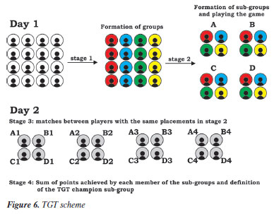 Firstly, we sorted out the 16 students in descending order of performances in previous exams in the course. So, we set up four sub-groups (A-D) with one student from each group, ensuring that the sub-groups were internally homogeneous and of similar levels. Next, students from sub-groups (A-D) participated in Round 1 of the Stereochemistry Race to determine their positions (A1, A2, A3, A4... B1, B2, B3, B4... C1, C2, C3, C4... D1, D2, D3, D4) within each group based on their performance in the game. After this first class, students could play the Stereochemistry Race at home to prepare for the next round. Round 2 was played during the next class where the first-place players (A1, B1, C1, D1….A2, B2, C2, D2… A3, B3, C3, D3… A4, B4, C4, D4) in each group played against each other. The same thing happened with second, third, and fourth places. In Round 2, players won 25 points (first place), 18 points (second place), and 12 points (third place). The last ones did not get any points. Finally, the scores achieved by each student were added up, totaling the points of the sub-groups and defining who the tournament champion was. Figure 6 summarizes the TGT process.