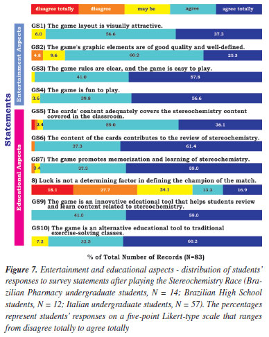 The time spent in Round 1 (game matches held between members of each sub-group) ranged from 37 to 66 minutes (58 on average), and the time spent in Round 2 (game matches held between members of sub-groups) ranged from 35 to 41 minutes (37 on average). The lower time spent in Round 2 was due to an agreement between the students, who established a maximum time of 40 seconds to answer the questions. In April 2024, we repeated the TGT process with twelve high school 12th-grade students (four males and eight females) from Colégio Maximus in Fortaleza, Brazil. They spent 35 minutes on average in Round 1 and 45 minutes on average in Round 2. In May 2024, at the Università degli Studi di Genova, in Italy, sixteen first-year Natural Science undergraduate students and forty-one first-year Biotechnology students also participated in the TGT. The Italian students spent about 50 minutes in both rounds. Evaluation process This study has a mixed descriptive nature, both quantitative and qualitative, allowing for an in-depth investigation of stereochemical concepts and representations.31 Such an approach, combined with exploratory and confirmatory aspects, brings the researcher closer to the object of study, being used to identify and analyze relevant variables that may influence the results, promoting a rigorous statistical analysis.31,32 Combining these techniques generates insights that can contribute to using TGT in teaching stereochemistry as a complementary strategy. Moreover, adopting the appropriate analytical tools ensures the validity and reliability of the data obtained, strengthening the study's conclusions. Data collection and analysis techniques An electronic form was used to evaluate the game and the tournament. It has adopted a five-point Likert scale ranging from "strongly agree" to "strongly disagree", followed by subjective questions. Additionally, the UES-SF scale (User Engagement Scale-Short Form) was employed to measure student engagement and behavior toward the tournament and their emotional interactions.33 The choice of this scale was due to its ability to objectively and concisely assess the level of engagement between humans and technology (familiarity with technologies), offering a comprehensive analysis of the experience within the educational context.25,26 Using a widely validated scale such as the UES-SF also strengthens the research, broadening the validation evidence and ensuring greater robustness and credibility to the results obtained. The form was divided into three sections (see Table 1S of the Supplementary Material). The first section presented students with ten statements (GS1-GS10) related to the graphical interface, content, and usefulness of the game, as well as two open-ended questions (GS11-GS12) about the positive and negative aspects of the game, and a rating from 0 to 10 for the game (GS13). In the second section, the TGT strategy was evaluated through eight questions (TS1-TS8), followed by two open-ended questions (TS9-TS10) regarding the positive and negative aspects of the TGT rounds, as well as a rating from 0 to 10 (TS11) for the tournament as a strategy for reviewing stereochemistry concepts. Finally, the third section included twelve questions to measure user engagement in the TGT using the UES-SF scale.