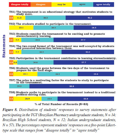 During the application of the game, it was observed that the concepts of absolute configuration (R/S) and optical isomerism were the most discussed among the students. The participants demonstrated greater difficulty in questions related to the nomenclature of chiral compounds, while the cards about molecular symmetry questions had a higher rate of correct answers. These observations suggest that the game not only engaged the students but also promoted the review and active discussion of stereochemistry concepts, indicating a potential impact on learning, as we can identify from the students' oral feedback below. "A great tool for memorizing content, through interactive questions that are fun and good for reviewing." "The questions cover the content in a great way." "It covers the entire subject; it is practical for reviewing the content." "Many cards, which allow the student to practice different compounds, help to retain the content more interestingly and interactively." "Easy to play, cards that cover the subject's content well, and you can choose to depend on luck by rolling the dice or just going with the correct answers." "The game is very fun and allows you to understand what you have really learned and what you are having difficulty with." "The game promotes cooperation and teamwork while reviewing the content covered in the cards." "It explores many styles of questions that can be asked on exams." "It helps students review stereochemistry and the aspect of working under ‘pressure'." Figures 7 and 8 present the results of the students' evaluation of the game and the TGT strategy, respectively. Based on the collected data, we used a Likert-based assessment technique to analyze the effectiveness, applicability, and engagement level of the game and the TGT.