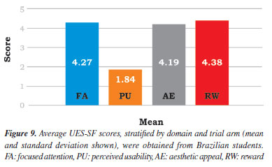 Based on the students' comments, it can be concluded that the game proved to be an effective and dynamic educational tool for reviewing stereochemistry concepts in a playful manner. The positive aspects mentioned were the number of cards, gameplay, intuitive interface, originality, and game interactivity. Additionally, its structure encourages both teamwork and healthy competition among participants. Among the negative points mentioned by the students, the element of luck was the most cited, However, it is an inherent aspect of any game, including the different rounds of TGT. Two students pointed out the size of the cards as an issue; however, as previously highlighted, increasing the size can be quickly done by holding down the card on mobile devices or hovering the cursor over it on computers. Two students also reported technical issues caused by internet connection problems, which are external to the game, and only one respondent considered the game confusing. Evaluating the TGT Figure 8 represents the analysis of the data collected in Section 2 (see Table 1S, and Tables 5S to 7S of the Supplementary Material). Based on the students' responses, the tournament (TS3) was exciting and promoted the review of stereochemistry concepts. The tournament format was well received (TS4), and the students considered this educational strategy motivating, encouraging them to study the content more frequently (TS1 and TS2). They believe that teaching strategies such as the tournament contribute to their learning in stereochemistry (TS5). The additional points offered as prizes were a motivating factor, encouraging them to review the content to participate in the tournament (TS7). In addition, considering that the students could play the Stereochemistry Race between the two days of the event, they agreed that this practice helped them better prepare for Round 2 (TS6). Lastly, a significant percentage (53.0%) of the students preferred participating in the tournament over a traditional problem-solving class (TS8). These results make us believe that the game and the tournament reached their goal of engaging students in reviewing stereochemistry. Evaluating the students' engagement in TGT "User engagement" is a central aspect of user experience, representing the degree of involvement of an individual when interacting with a digital resource. In recent years, measuring this engagement has sparked increasing interest in human-computer interaction, especially in educational systems. To understand how the tournament promoted engagement and interest in participation, we invited students to answer the questions proposed in the electronic form UES-SF.35 This scale is a tool composed of twelve questions divided into four domains, which consider how people use (PU) and regard the visual aspect of the system (AE), analyze participant concentration within the system (FA), and measure interaction, curiosity, interest, and perceived involvement in the experience (RW). Figure 9 shows the overall engagement from each domain obtained from all the students who participated in the tournaments (see Table 8S and Figures 4S and 5S of the Supplementary Material). The overall engagement UES-SF score was 4.25 ± 0.27 (the closer to 5, the greater the engagement). Therefore, we can conclude that the TGT engaged the students in reviewing the concepts related to stereochemistry.