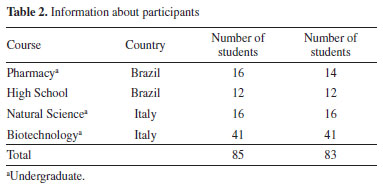 RESULTS AND DISCUSSION The students' data is protected by the General Data Protection Law (LGPD) - Law No. 13.709/18, as provided in Article 7, Section I, expressed freely and unequivocally.34 Of the 85 students involved in this methodological investigation, two Brazilian university students did not complete the evaluation form, and therefore, their data was not included, as shown in Table 2.