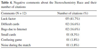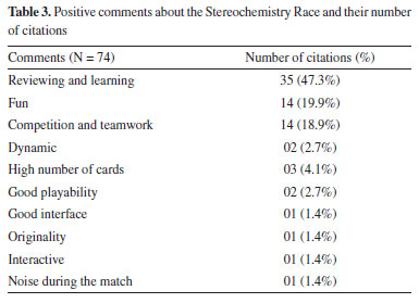 Evaluating the game Through the electronic form, we asked students to identify the positive and negative aspects (GS11-GS12, Tables 1S to 4S of the Supplementary Material) of the game "Stereochemistry Race", conducting a qualitative analysis. Of the 83 students who responded, 74 left positive comments, and 12 mentioned negative aspects. These comments were organized according to their frequencies in Tables 3 and 4.