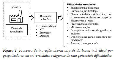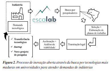 Entre elas, a indústria tem dificuldade de encontrar o pesquisador adequado no meio acadêmico, dificuldade de comunicação e conexão entre pessoas da indústria e da academia, tempo de desenvolvimento/resposta do pesquisador, normalmente mais lento que a urgência da indústria, dificuldades burocráticas, legais e de propriedade intelectual (PI) e dificuldades para levar tecnologias para TRLs maiores, escalonar as tecnologias e realizar análises de viabilidade técnica e econômica.2 Ademais, não é raro as entregas dos projetos estarem aquém do esperado pela indústria ou pela parte interessada na solução. Isto se dá devido a problemas de planos de trabalho mal escritos, gestão não ágil dos projetos e diferenças culturais entre profissionais do meio acadêmico e da indústria. O olhar limitado sobre desenvolvimento de tecnologia, bem como uma má condução de análises de riscos, somados ao mal acompanhamento por parte das indústrias ao dia a dia da pesquisa, potencializam resultados não proveitosos e frustração de ambas as partes. De fato, o que se observa na prática é que, sem uma boa gestão, a relação indústria-universidade pode ser muito improdutiva. No que tange PI, o Brasil tem se portado como adaptador de tecnologias externas, sendo necessário um desenvolvimento interno para facilitação da produção de PI.3 Segundo Viana et al.,4 o estágio de produção de patentes no Brasil ainda é considerado embrionário e pouco relevante, com média de 13,8% de concessão de patentes, que ocorrem principalmente devido ao elevado tempo de análise no INPI (Instituto Nacional de Propriedade Intelectual) - em média 12 anos. Cerca de 21% das instituições de pesquisa no Brasil têm contratos relacionados a patentes com empresas, o que leva a conclusão de que não há um eficiente aproveitamento do conhecimento e das inovações produzidas no país. Dentre as principais dificuldades para elaboração de patentes destacam-se: custos de produção,5 falta de legislação específica que apoie a transferência tecnológica entre universidade-empresa, baixa autonomia dos escritórios que redigem as patentes e ineficiência na prospecção tecnológica e avaliação técnica e econômica da patente.4 Soares et al.6 mostraram que a associação aos ecossistemas mais robustos de inovação favorecem o número de patentes no Brasil, o que é caracterizado pela predominância da região Sudeste e Sul do país neste quesito. Mendonça et al.7 mostraram que a falta de treinamento para escrever uma patente também eleva os indicadores de reprovação de PI. Dalmarco et al.8 demonstraram em seu estudo que a indústria também apresenta dificuldade no desenvolvimento de patentes com a universidade, pois predomina neste meio a contratação das universidades para prestações de serviço, que não resguardam o desenvolvimento de PI após o desenvolvimento do trabalho, mesmo em cenários em que isto seria possível. Outro aspecto citado é a dificuldade por parte das empresas em viabilizar economicamente tecnologias sustentáveis que são protegidas. Isto ocorre, pois as empresas não assumem os riscos associados ao escalonamento de projetos, uma vez que estes podem levar a perdas de produção e trazem risco de investimento. Esta aversão à inovação dificulta a implantação de tecnologias desenvolvidas entre as partes. O Escalab9 é um centro de escalonamento de tecnologias e modelagem de negócios da Universidade Federal de Minas Gerais (UFMG) que surgiu com a missão de promover a conexão entre as pesquisas realizadas em universidades e ICTs com o meio industrial. A especialidade do Escalab é o escalonamento de tecnologias de hard Science e modelagem de negócios, permitindo sua implementação em ambiente relevante/industrial, promovendo uma conexão que frutifique em PI utilizável. Atualmente, são duas as principais formas de interação com a indústria: (i) o desenvolvimento de tecnologias que podem ser desde a Pesquisa e Desenvolvimento (P&D) ao escalonamento para protótipos contando com a elaboração e operação de plantas pilotos e, (ii) programas de inovação aberta, onde as tecnologias são coordenadas e promovidas por especialistas pesquisadores de instituições públicas e privadas. Neste segundo modelo, chamado de "Programas de Inovação Aberta Escalab", ocorre a promoção da conexão universidade-indústria para o avanço tecnológico e, em alguns casos, a criação de novos negócios. Nesses programas, as empresas apresentam desafios para a comunidade acadêmica e o ecossistema de inovação. Na sequência é realizado um mapeamento de proponentes/iniciativas que seguem para uma criteriosa avaliação realizada com o intuito de qualificar e categorizar as soluções que mais se adequam aos desafios propostos. Todo desenvolvimento é feito em conjunto entre as partes, através de um plano de trabalho detalhado e comum, com cronograma, planejamento experimental e análise de riscos. O programa, que contém etapas de pré-aceleração e aceleração, é executado a fim de validar a viabilidade técnica da tecnologia proposta, juntamente ao levantamento da viabilidade econômica. Além disso, o gerenciamento dos aspectos legais e contratuais com as diferentes instituições (ICTs e empresas) é feito com apoio do Escalab. Ao final, três importantes desfechos podem ser alcançados: (i) uma tecnologia transferida das instituições de pesquisa à indústria; (ii) a criação de uma startup de prestação de serviço para a indústria; (iii) ou um novo projeto de pesquisa a ser desenvolvido entre as partes (Figura 2).
