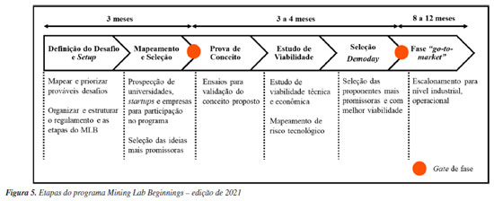 O SBQ Acelera foi um programa de pré-aceleração a nível nacional com o objetivo de conectar universidades e indústrias. O programa foi realizado em parceria a Sociedade Brasileira de Química (SBQ), o INCT Midas, Associação Wylinka e parceiros estratégicos, como Abiquim e Sebrae. O programa teve por objetivo o desenvolvimento tecnológico, além da formação empreendedora para docentes e discentes da Química e áreas correlatas. Além disso, tiveram duas empresas parceiras, a Oxiteno e Rhodia-Solvay, que propuseram 6 desafios para mapeamento de soluções. O programa recebeu 38 inscrições de 10 estados brasileiros e 22 instituições de ensino superior brasileiras. Foram selecionadas 10 equipes participantes e, ao final, uma startup foi criada. O SBQ Acelera teve duração de 12 semanas e foi realizado em formato híbrido, dividido em três módulos: mercado, modelo de negócios e validação. O Desafio Nacional Granioter-MCTI é um programa de pré-aceleração e aceleração organizado pelo Granioter e o Ministério de Ciência, Tecnologia e Inovação (MCTI). O programa mapeou tecnologias em minerais estratégicos e materiais avançados em todo o Brasil. Após seleção de 15 equipes, foram disponibilizadas conteúdos para desenvolvimento de modelo de negócios, estudo da viabilidade econômica e escalonamento das tecnologias, a partir de mentorias individuais e encontros síncronos. Ao final da etapa de pré-aceleração, as equipes participaram de um demoday para apresentação de pitch para uma banca formada por empresas parceiras do programa. A etapa de aceleração está em andamento e as 10 equipes selecionadas no primeiro demoday continuam seu desenvolvimento. Nexa e o programa "Mining Lab Beginnings" A Nexa Recursos Minerais é a quinta maior produtora de zinco do mundo. Na América Latina, possui operações distribuídas pelo Brasil e Peru. São responsáveis por 4% da produção mundial de zinco e também produzem outros concentrados metálicos como subprodutos: cobre, chumbo, prata e ouro. Em 2016, a Nexa criou uma plataforma com ações de inovação, o Mining Lab, com objetivo de estimular a inovação aberta e o empreendedorismo por meio de desafios relacionados à indústria minero-metalúrgica. Atualmente, são cinco programas complementares que conectam as necessidades da empresa com o ecossistema global de inovação, como universidades, hubs de inovação e outros (Figura 4). São eles: