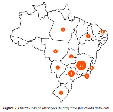 Mapeamento e seleção Fazer a divulgação e mapeamento de soluções demanda diferentes estratégias de comunicação. Para esta finalidade, diversas ferramentas foram utilizadas como: webinários (onde a dinâmica do programa, bem como o desafio eram explicados), redes sociais, relaeases em sites de parceiros e convites de especialistas a partir de buscas na plataforma Lattes. Ao final do processo foram captadas trinta e sete iniciativas no programa, sendo de vinte e seis universidades diferentes e uma startup. A Figura 6 apresenta as universidades com mais inscrições. Através dela é possível observar que a região sudeste apresentou grande número de inscrições com a presença de grandes universidades, como Universidade Federal de Minas Gerais (UFMG), Universidade Federal de Viçosa (UFV), Universidade de São Paulo (USP), Universidade Federal de Juiz de Fora (UFJF) e Universidade Federal de Uberlândia (UFU). Outras universidades apareceram somente com uma inscrição, porém houve inscrições de todas as regiões do país.
