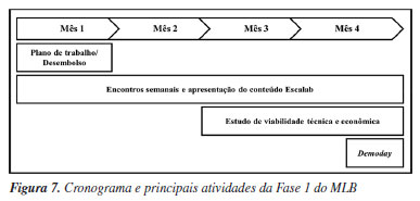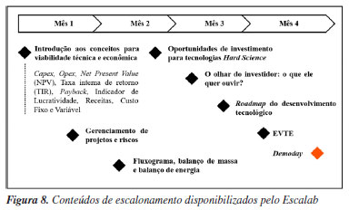 Após a seleção das equipes é elaborado um plano de trabalho com métricas e indicadores bem definidos. Nele se propõe os experimentos a serem conduzidos, os métodos utilizados tanto para realização dos experimentos como para caracterização e validação das rotas tecnológicas. As entregas propostas no trabalho são definidas de maneira mensurável e objetiva, de modo que possam ser validadas posteriormente. Todos os insumos para execução da prova de conceito são listados com três orçamentos indicados, de modo que todo o recurso disponibilizado nesta etapa (R$ 15.000,00 - quinze mil reais por proponente) possa ser utilizado de maneira útil e otimizada para garantir a execução do trabalho. A rotina mensal do programa é composta de reuniões semanais, as quais contam com participação da equipe técnica da Nexa do Escalab. Nas reuniões há discussão dos resultados obtidos durante a validação experimental, bem como discutido os próximos passos, insumos em processo de compra e quais os próximos a serem comprados, validação dos resultados parciais e entregas exigidas durante todo o cronograma. Semanalmente também são disponibilizados conteúdos para auxílio ao escalonamento das tecnologias propostas. Seu objetivo é auxiliar e desenvolver a perspectiva empreendedora dos participantes, além de fornecer premissas e conhecimento para elaboração de um estudo de viabilidade técnica e econômica (EVTE), que é apresentado posteriormente no demoday. Os conteúdos abordados pelo Escalab nas reuniões estão apresentados na Figura 8.