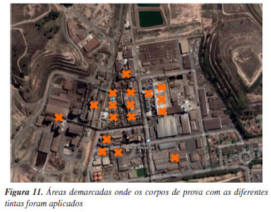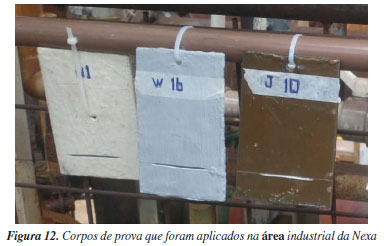 Para o pigmento anticorrosivo para tintas, produziu-se tintas à base de resina epóxi. Elas foram aplicadas sobre corpos de prova (chapas de aço SAE 1020 de 100 × 100 × 2 mm) para comparação com outras tintas típicas de mercado que operam com o mesmo objetivo de minimizar o impacto causado pela corrosão em ambientes classificados como altamente corrosivos pela norma ISO 922318 (C4 e C5). A própria Nexa, por possuir um processo hidrometalúrgico e por produzir ácido sulfúrico como um de seus produtos, possui ambiente adequado para realização dos ensaios em ambiente relevante. Os corpos de prova foram aplicados em dezessete áreas distintas da planta, conforme Figura 11, e deixados por um ano em cada ponto. O intuito foi o acompanhamento da corrosão em cada corpo de prova e a resistência de cada revestimento utilizado. Ao final do período, os corpos de prova foram coletados e enviados à caracterização da espessura final do revestimento (ASTM D7091-13),19 aderência após exposição (ASTM D4541),20 avaliação do desempenho de proteção do revestimento (ASTM D1654-0821 e ASTM D61022). A Figura 12 apresenta alguns corpos de prova que foram submetidos ao teste de durabilidade e resistência na Nexa.